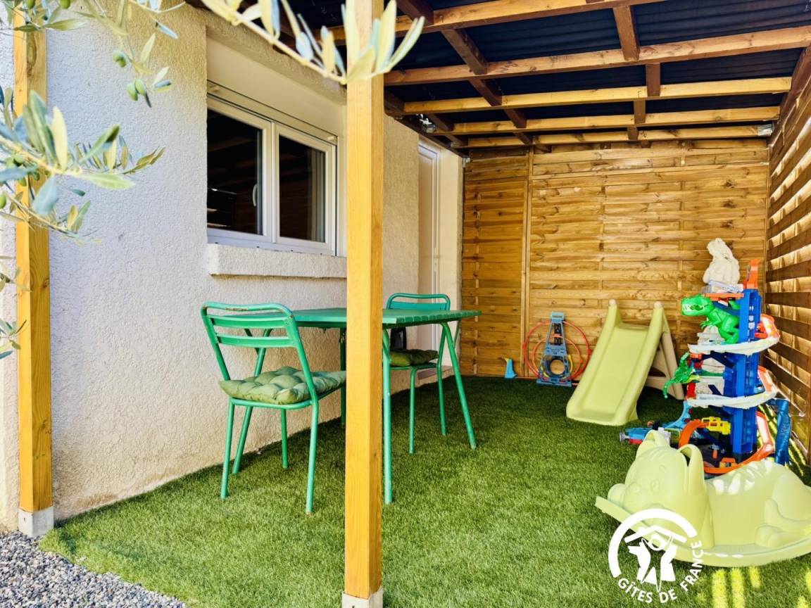 Im Außenbereich befindet sich ein komplett umzäunter Bereich mit einem kleinen Schuppen, einer überdachten Terrasse und einem Grillplatz mit Gartenmöbeln. Haustiere sind auf Anfrage willkommen (da sich Tiere auf dem Gelän