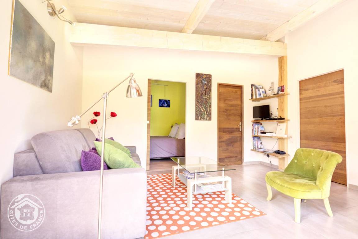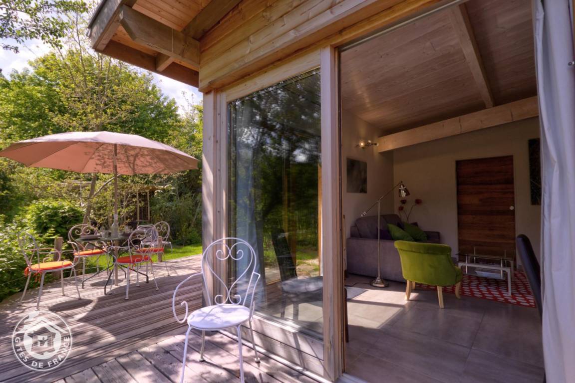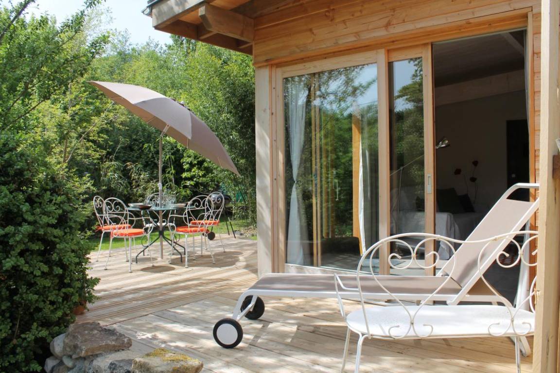 Freistehendes Haus auf dem Grundstück der Gastgeber. Eingang offen zum Wohnzimmer mit Schlafcouch (Schlafmöglichkeit für 2 Personen 140 x 200 cm), 1 Schlafzimmer (1 Doppelbett 140 x 200 cm). Badezimmer (Dusche) mit Infrarotsauna. Angenehme Sonnenterrasse ohne vis-à-vis.