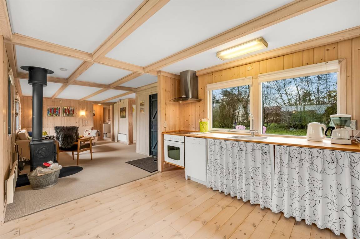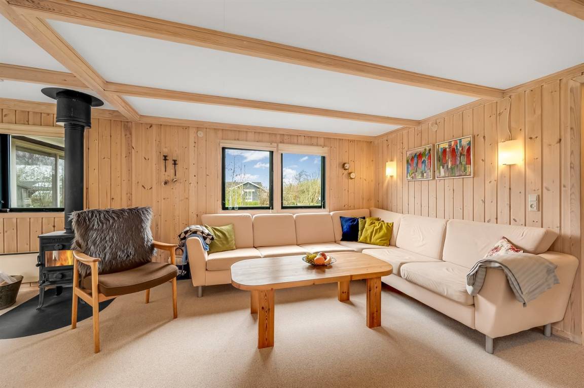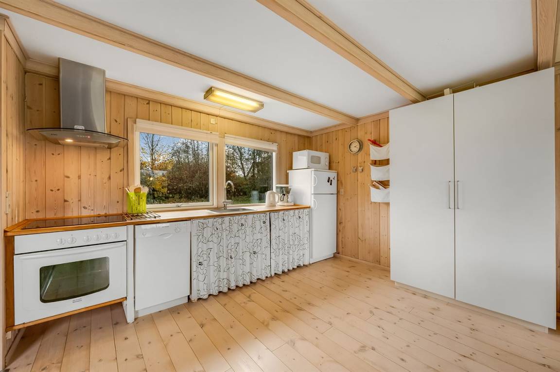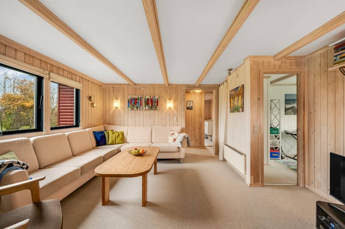 DraußenDie Ferienunterkunft liegt auf einem 1200 m² großen Naturgrundstück. Die Entfernung zum Fjord beträgt 400 m. Die nächste Einkaufsmöglichkeit liegt 7000 m entfernt. Es steht ein 65 m² Terrassenareal zur Verfügung. Parkplatz auf dem Grundstück.