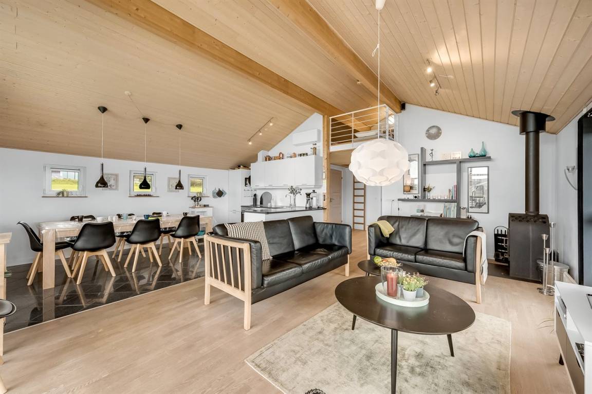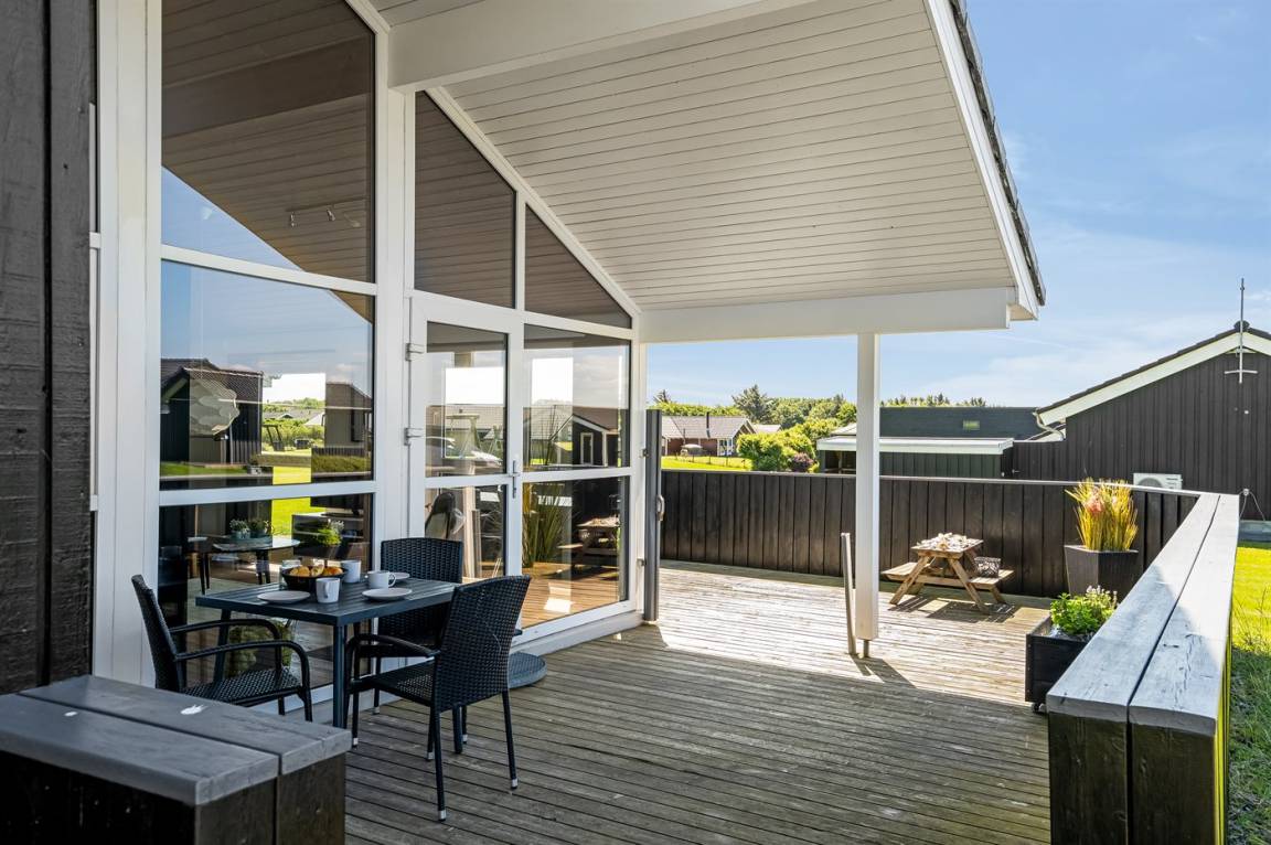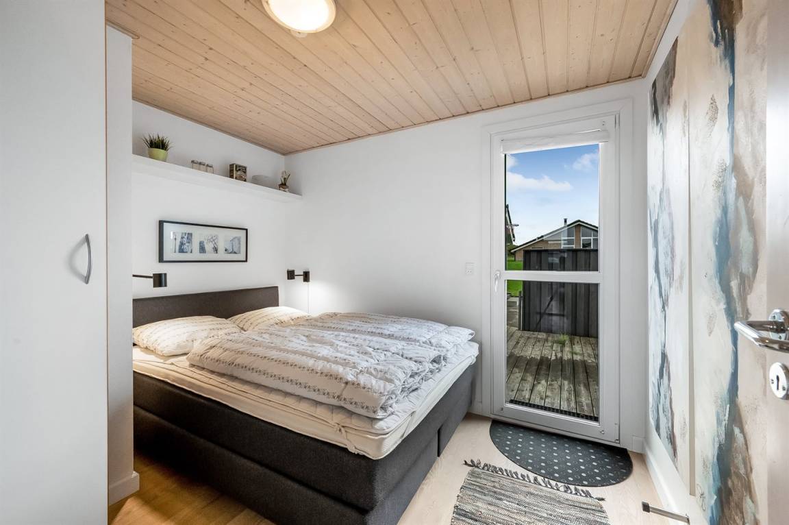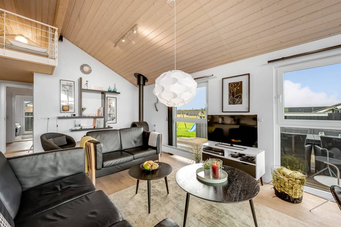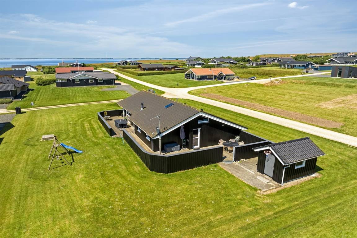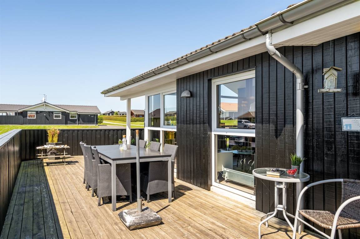 Besonders hübsches Ferienhaus aus Holz, 2005 gebaut, auf einem schönen Natur-/Gartengrundstück nur 300 m vom Wasser entfernt gelegen. Sowohl vom Haus als auch vom Grundstück gibt es eine hübsche Aussicht über das Wasser. Zum Haus gehören eine schöne, große, sowohl offene als auch überdachte Terrasse mit diversen Gartenmöbeln. Hübsche beheizbare Klinkerböden in der Küche, Essabteilung und im Badezimmer. Holzböden in den übrigen Räumen. Hell gestrichene Wände sowie Holzdecken. Schönes, großes Badezimmer mit Duschnische, 2-Pers.-Whirlpool sowie direktem Zugang zur Sauna des Hauses. Ferner schöne Gästetoilette. Küche in offener Verbindung mit dem Wohnzimmer, die mit u. a. Geschirrspüler, Mikrowelle, Umluftofen, Herd mit Ceran-Feld und Tiefkühlgerät ausgestattet ist. Schönes großes und nett möbliertes Wohnzimmer mit Kaminofen, DVD-Spieler, TV mit digitalem Satellitenanschluss und Stereoanlage mit CD-Spieler sowie Kostenlose WI-FI Internetverbindung. Die Schlafplätze des Hauses verteilen sich auf 2 Schlafzimmer mit Doppelbett und 1 mit 2 Einzelbetten sowie ein gutes offenes Obergeschoss mit 2 Schlafplätze für Kinder. An weiterer Ausstattung können Waschmaschine sowie Wäschetrockner erwähnt werden und es ist eine energiesparende Wärmepumpe installiert. Für die Kinder stehen Kinderhochstuhl und Kinderbett sowie Sandkasten, Schaukel, Rutsche und verschiedene Spiele zur Verfügung. Ein sehr schönes Ferienhaus zu jeder Jahreszeit, das in einem schönen Feriengebiet mit vielen Aktivitätsmöglichkeiten liegt, u. a. Windsurfing, Angeln, Put & Take, Baden sowie Spaziergänge in der schönen Natur.