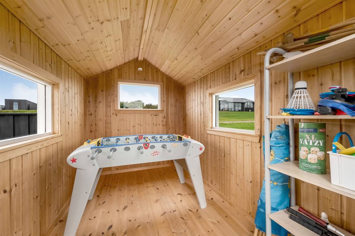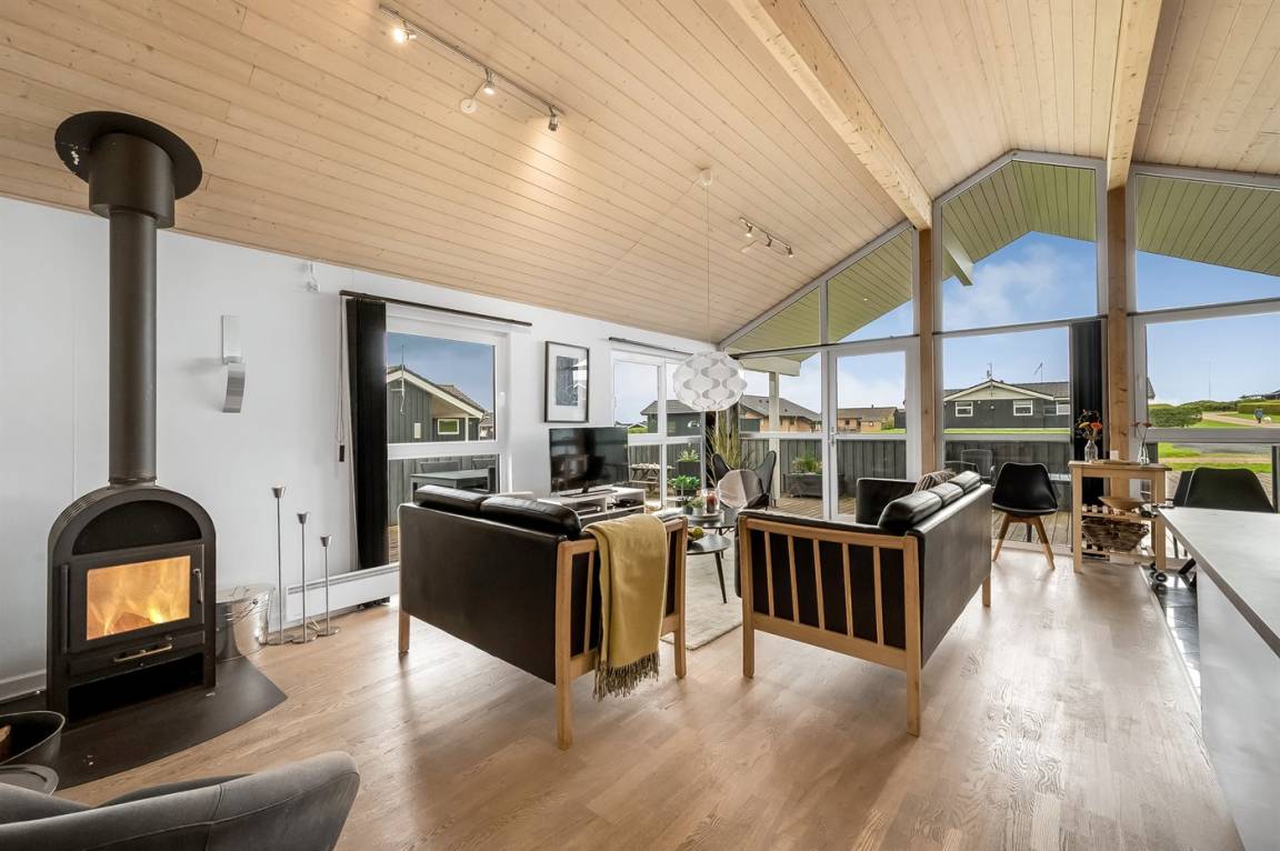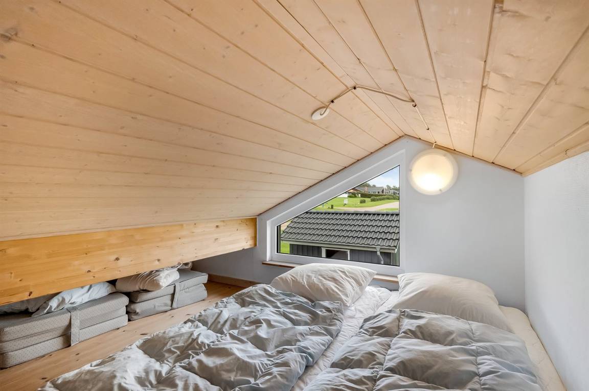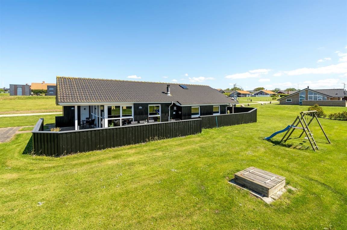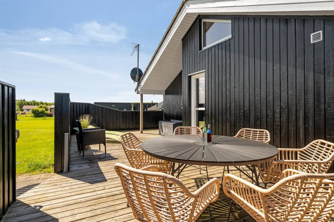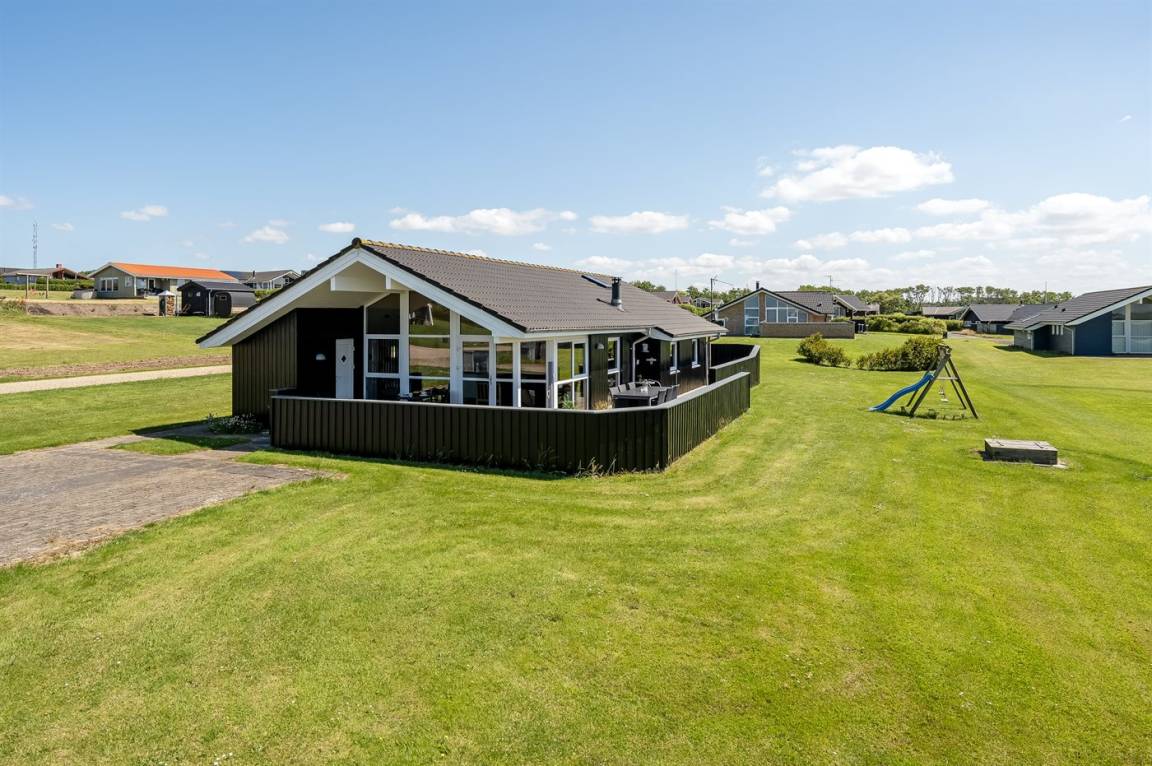 Besonders hübsches Ferienhaus aus Holz, 2005 gebaut, auf einem schönen Natur-/Gartengrundstück nur 300 m vom Wasser entfernt gelegen. Sowohl vom Haus als auch vom Grundstück gibt es eine hübsche Aussicht über das Wasser. Zum Haus gehören eine schöne, große, sowohl offene als auch überdachte Terrasse mit diversen Gartenmöbeln. Hübsche beheizbare Klinkerböden in der Küche, Essabteilung und im Badezimmer. Holzböden in den übrigen Räumen. Hell gestrichene Wände sowie Holzdecken. Schönes, großes Badezimmer mit Duschnische, 2-Pers.-Whirlpool sowie direktem Zugang zur Sauna des Hauses. Ferner schöne Gästetoilette. Küche in offener Verbindung mit dem Wohnzimmer, die mit u. a. Geschirrspüler, Mikrowelle, Umluftofen, Herd mit Ceran-Feld und Tiefkühlgerät ausgestattet ist. Schönes großes und nett möbliertes Wohnzimmer mit Kaminofen, DVD-Spieler, TV mit digitalem Satellitenanschluss und Stereoanlage mit CD-Spieler sowie Kostenlose WI-FI Internetverbindung. Die Schlafplätze des Hauses verteilen sich auf 2 Schlafzimmer mit Doppelbett und 1 mit 2 Einzelbetten sowie ein gutes offenes Obergeschoss mit 2 Schlafplätze für Kinder. An weiterer Ausstattung können Waschmaschine sowie Wäschetrockner erwähnt werden und es ist eine energiesparende Wärmepumpe installiert. Für die Kinder stehen Kinderhochstuhl und Kinderbett sowie Sandkasten, Schaukel, Rutsche und verschiedene Spiele zur Verfügung. Ein sehr schönes Ferienhaus zu jeder Jahreszeit, das in einem schönen Feriengebiet mit vielen Aktivitätsmöglichkeiten liegt, u. a. Windsurfing, Angeln, Put & Take, Baden sowie Spaziergänge in der schönen Natur.