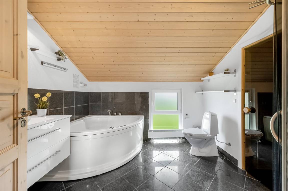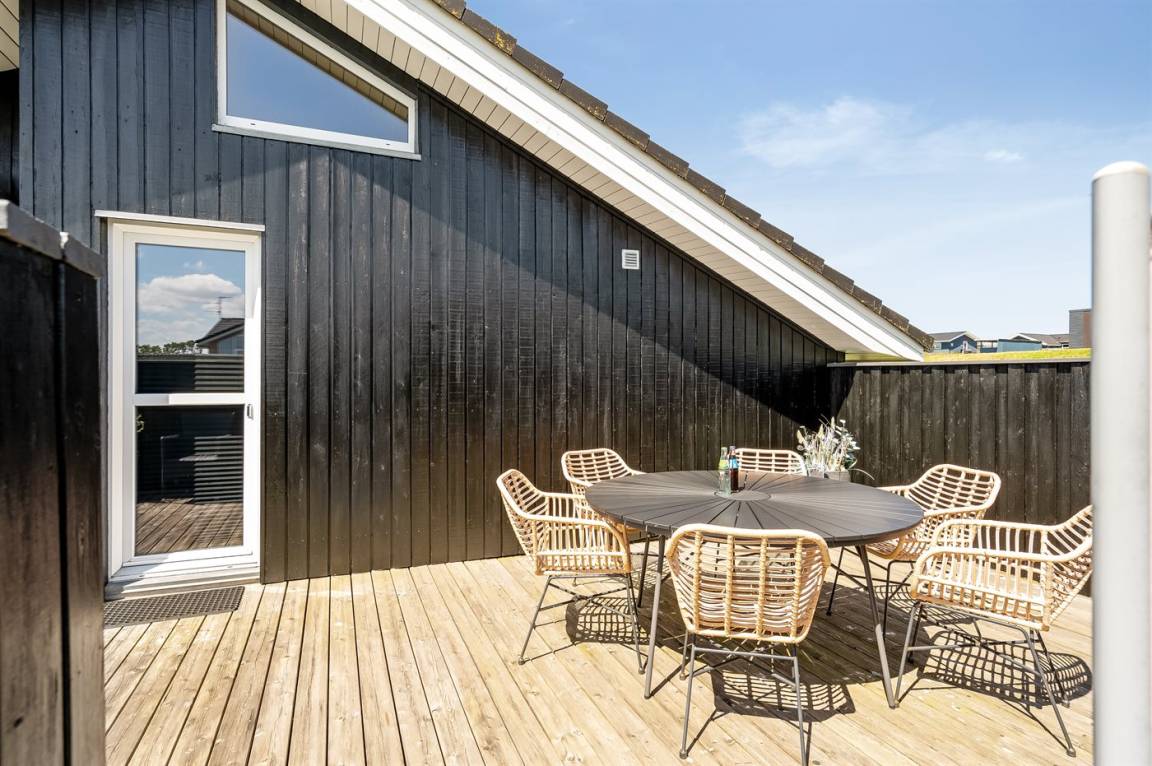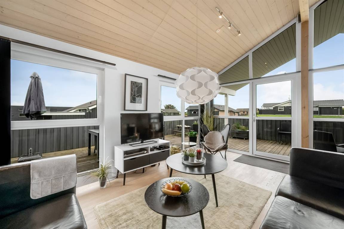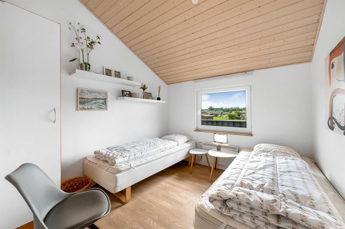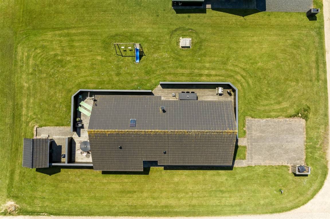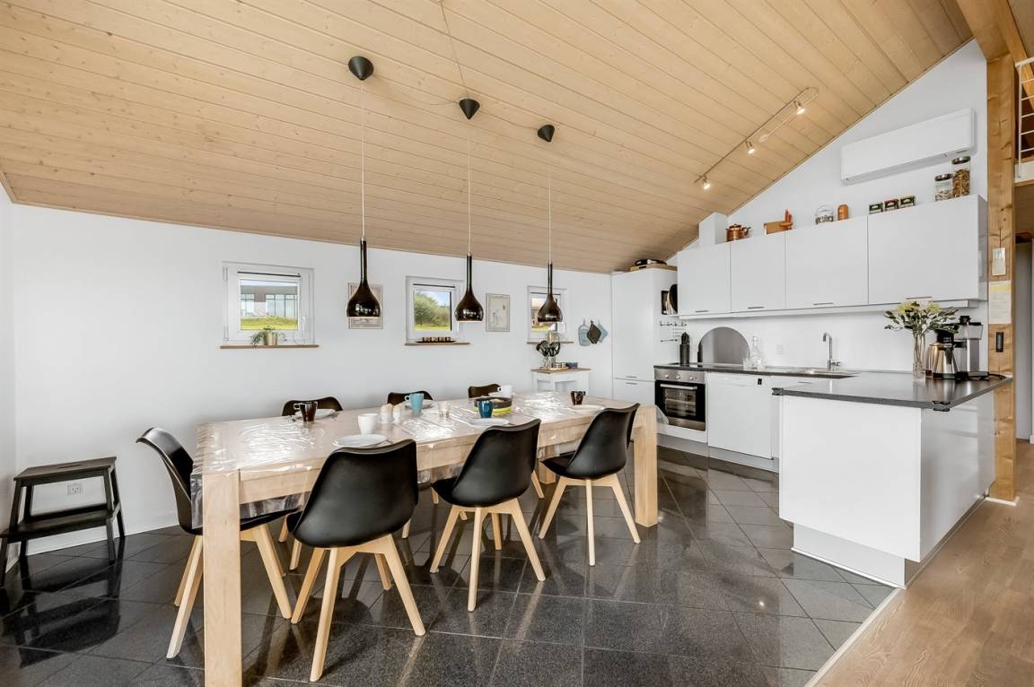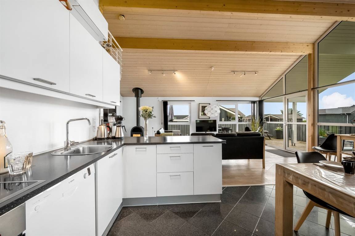 Besonders hübsches Ferienhaus aus Holz, 2005 gebaut, auf einem schönen Natur-/Gartengrundstück nur 300 m vom Wasser entfernt gelegen. Sowohl vom Haus als auch vom Grundstück gibt es eine hübsche Aussicht über das Wasser. Zum Haus gehören eine schöne, große, sowohl offene als auch überdachte Terrasse mit diversen Gartenmöbeln. Hübsche beheizbare Klinkerböden in der Küche, Essabteilung und im Badezimmer. Holzböden in den übrigen Räumen. Hell gestrichene Wände sowie Holzdecken. Schönes, großes Badezimmer mit Duschnische, 2-Pers.-Whirlpool sowie direktem Zugang zur Sauna des Hauses. Ferner schöne Gästetoilette. Küche in offener Verbindung mit dem Wohnzimmer, die mit u. a. Geschirrspüler, Mikrowelle, Umluftofen, Herd mit Ceran-Feld und Tiefkühlgerät ausgestattet ist. Schönes großes und nett möbliertes Wohnzimmer mit Kaminofen, DVD-Spieler, TV mit digitalem Satellitenanschluss und Stereoanlage mit CD-Spieler sowie Kostenlose WI-FI Internetverbindung. Die Schlafplätze des Hauses verteilen sich auf 2 Schlafzimmer mit Doppelbett und 1 mit 2 Einzelbetten sowie ein gutes offenes Obergeschoss mit 2 Schlafplätze für Kinder. An weiterer Ausstattung können Waschmaschine sowie Wäschetrockner erwähnt werden und es ist eine energiesparende Wärmepumpe installiert. Für die Kinder stehen Kinderhochstuhl und Kinderbett sowie Sandkasten, Schaukel, Rutsche und verschiedene Spiele zur Verfügung. Ein sehr schönes Ferienhaus zu jeder Jahreszeit, das in einem schönen Feriengebiet mit vielen Aktivitätsmöglichkeiten liegt, u. a. Windsurfing, Angeln, Put & Take, Baden sowie Spaziergänge in der schönen Natur.
