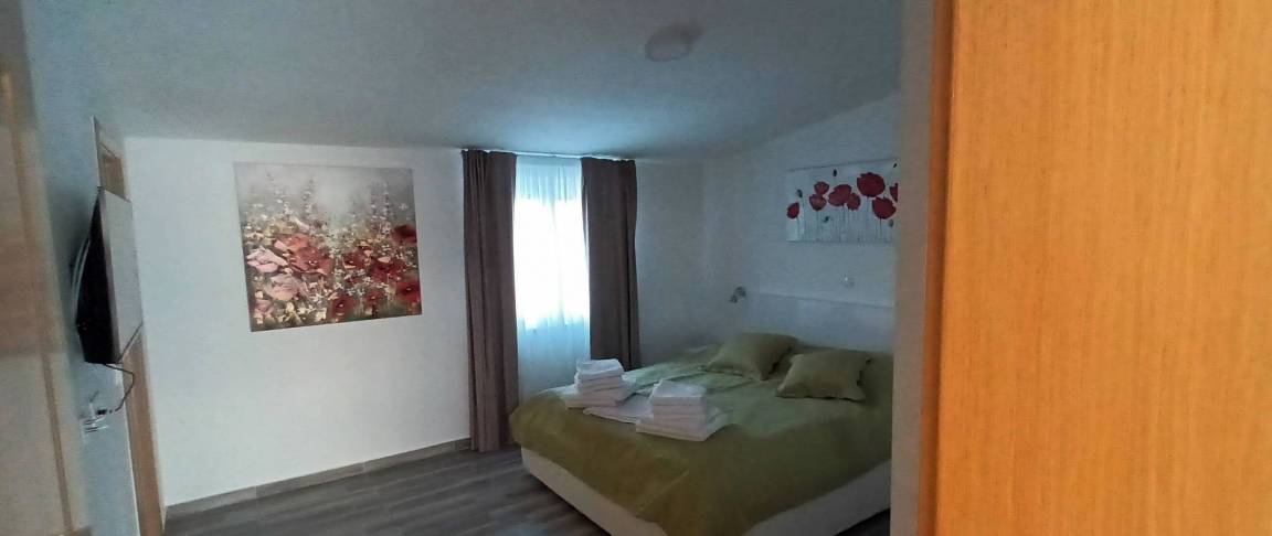 Ein kleinerer Teil der Villa ist als Studio mit einem Schlafzimmer mit Doppelbett, einem Schlafsofa, sowie Küchenzeile mit Kühlschrank, Cerankochfeld und einem Badezimmer ausgestattet