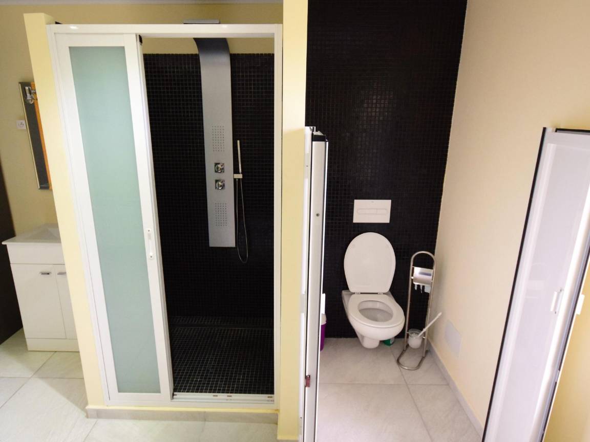 In der 1. Etage: Schlafzimmer mit Badezimmer mit 2x Einzelbett, Dusche, Waschbecken, Toilette, Klimaanlage