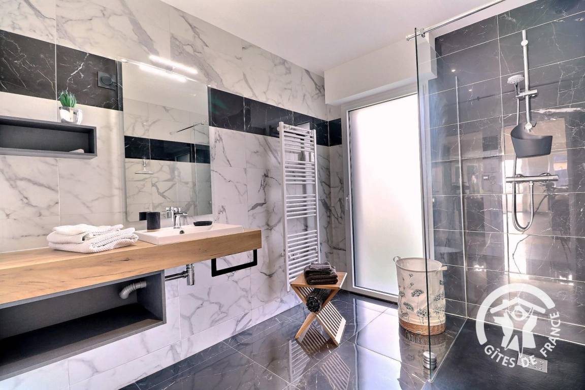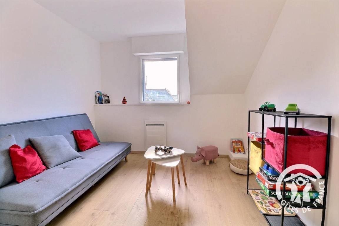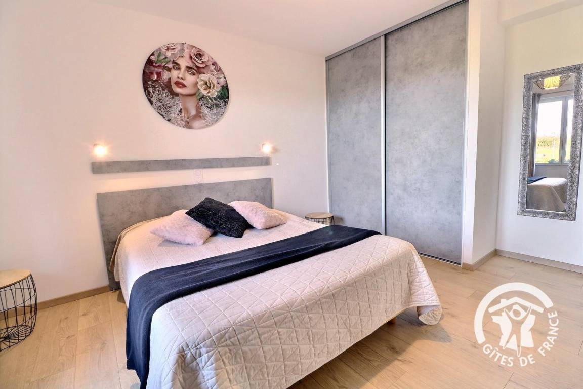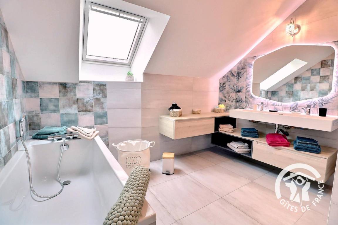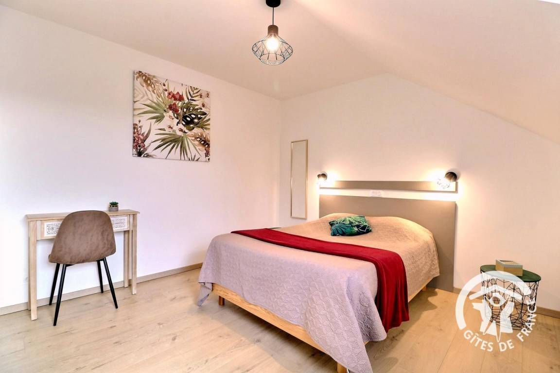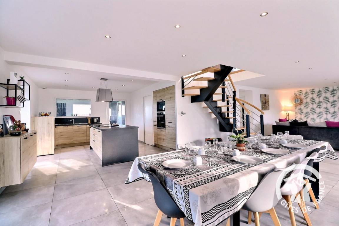 Im Erdgeschoss, das für Personen mit eingeschränkter Mobilität vollständig zugänglich ist: ein großes Wohnzimmer von 76 m² mit Küche, Essbereich und Wohnzimmer, ein Schlafzimmer mit einem 140 x 190 cm großen Bett, ein angepasstes Badezimmer, unabhängige angepasste Toiletten, eine Waschküche, ein Ruheraum mit SPA. Obergeschoss: Treppenabsatz mit Entspannungsbereich, Schlafzimmer mit Bett 160 x 200, Schlafzimmer mit Bett 140 x 190, Schlafzimmer mit drei Betten 90 x 190, Badezimmer mit Dusche und Badewanne, separates WC. Parkplatz auf dem Grundstück. Telearbeitsraum eingerichtet in einem Schlafzimmer im Erdgeschoss.