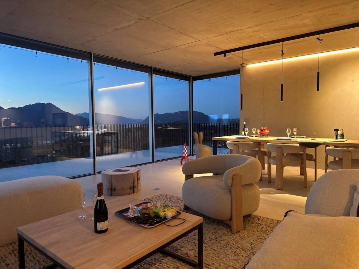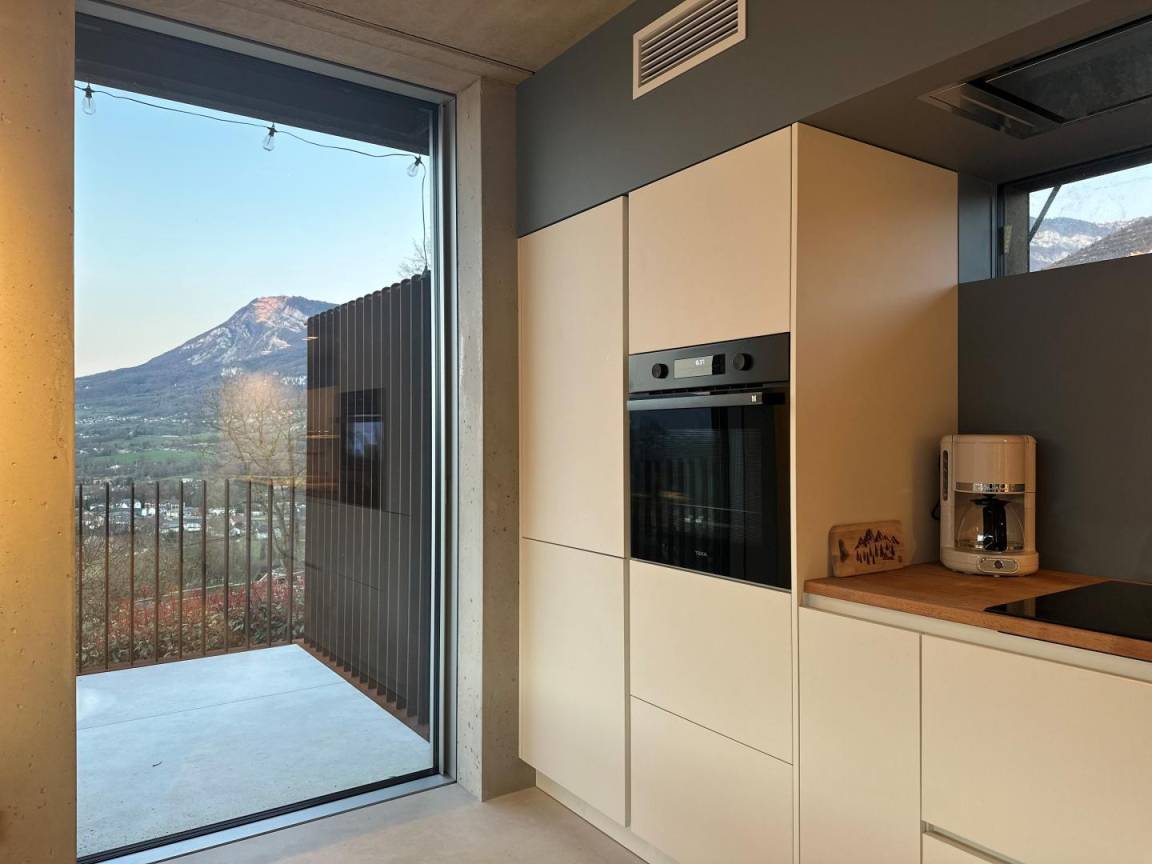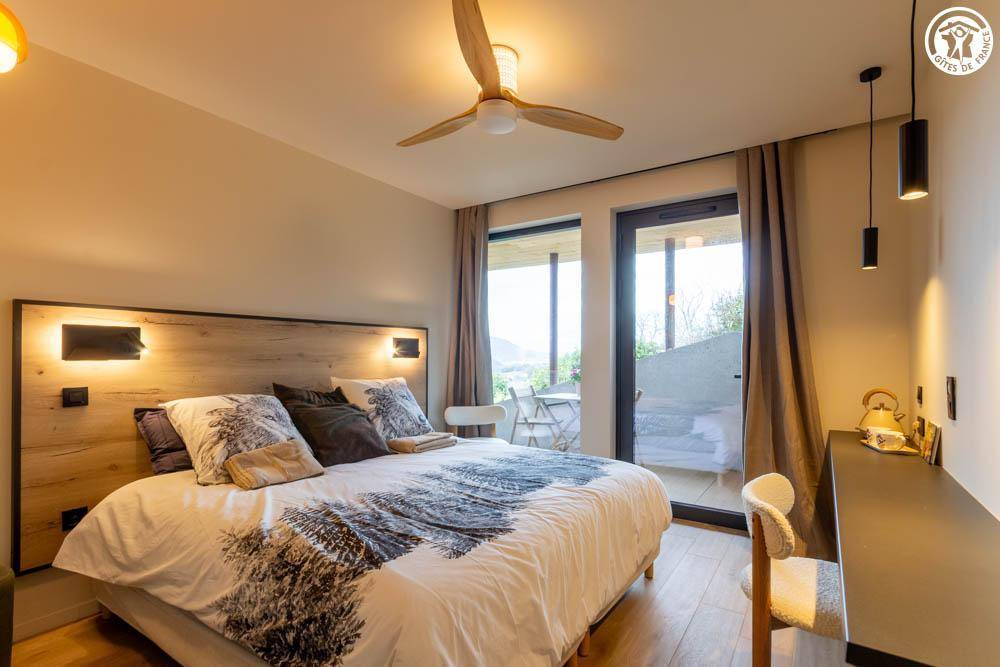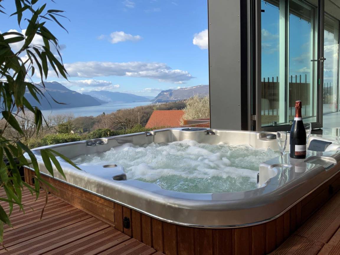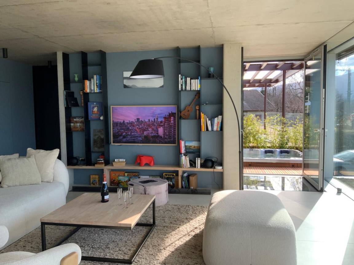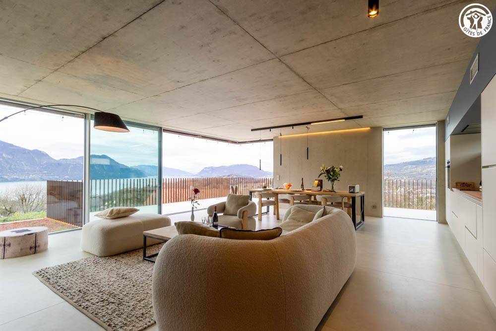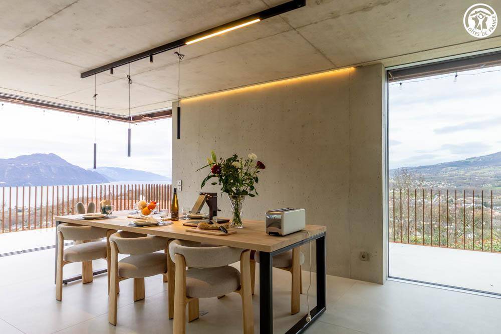 Dieses architektonisch gestaltete Haus liegt in den Hügeln oberhalb von Viviers-du-Lac, nur 3 km vom Lac d'Azur entfernt (Badebereich mit Badeaufsicht, Uferweg für Fußgänger und Radfahrer). Der helle Wohnbereich besticht durch große Glasschiebetüren, die auf eine geräumige, 31 m² große Balkonterrasse mit 180°-Panoramablick auf Aix-les-Bains, die umliegende Landschaft und den Lac d'Azur führen. Bettwäsche und Handtücher sind inklusive, die Betten sind bei Ankunft bezogen.