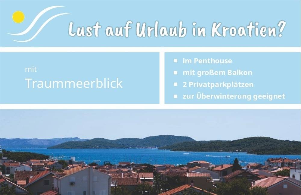Neue Penthousewohnung mit traumhaftem Panorama-Meerblick über die Bucht von Vodice und den mit Fähre, Wassertaxi oder dem eigenen/gemieteten Boot leicht zu erreichenden vorgelagerten Inseln, den Yachthafen, auf Berge und Strände.