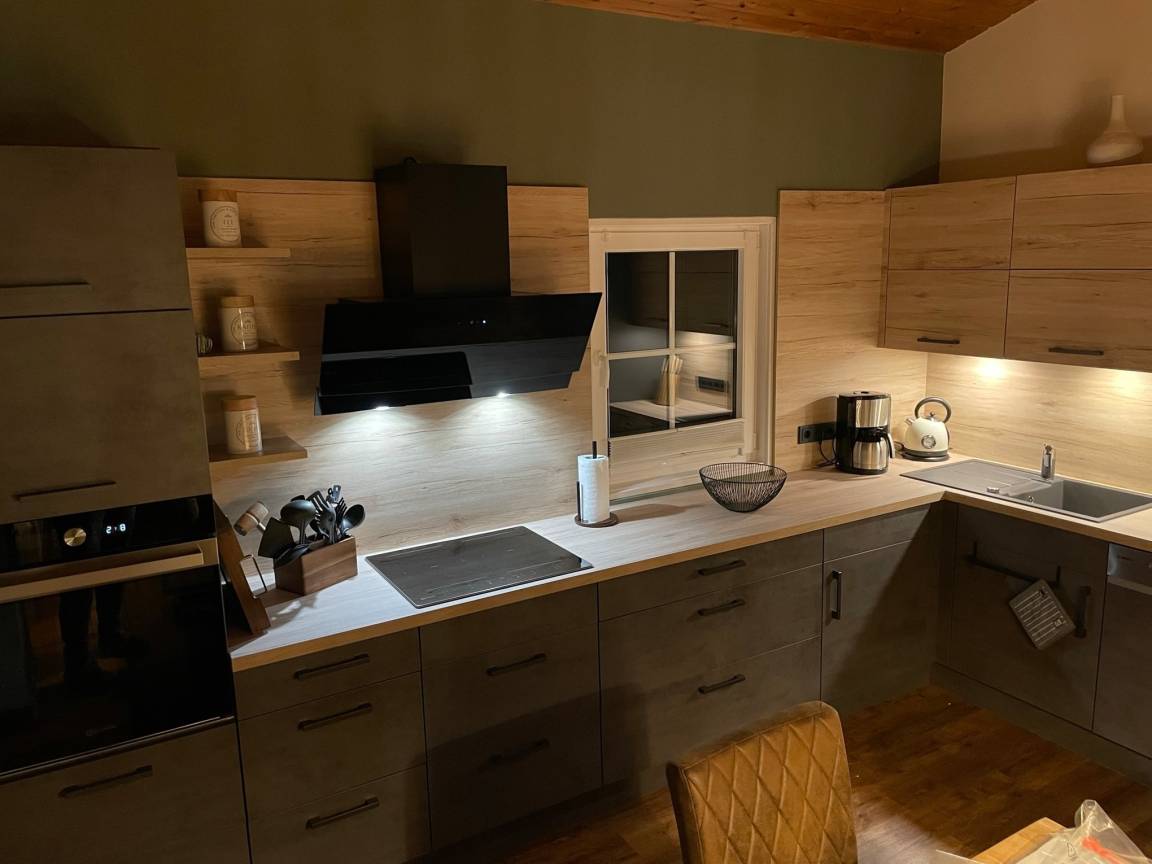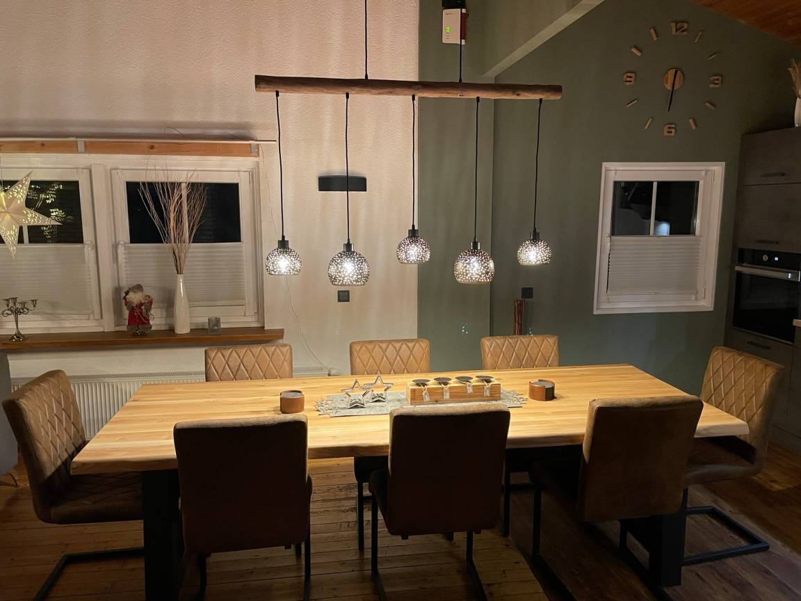 Das Herzstück des Hauses ist das großzügige Wohnzimmer mit gemütlichem Sofa, Holzofen, großem Esstisch sowie Smart-TV und WLAN. Die voll ausgestattete, moderne Küche lässt keine Wünsche offen und bietet beste Voraussetzungen für gemeinsames Kochen und Genießen.