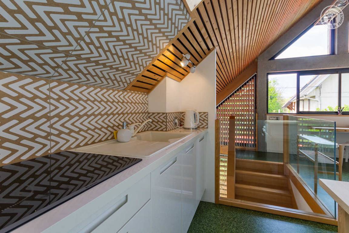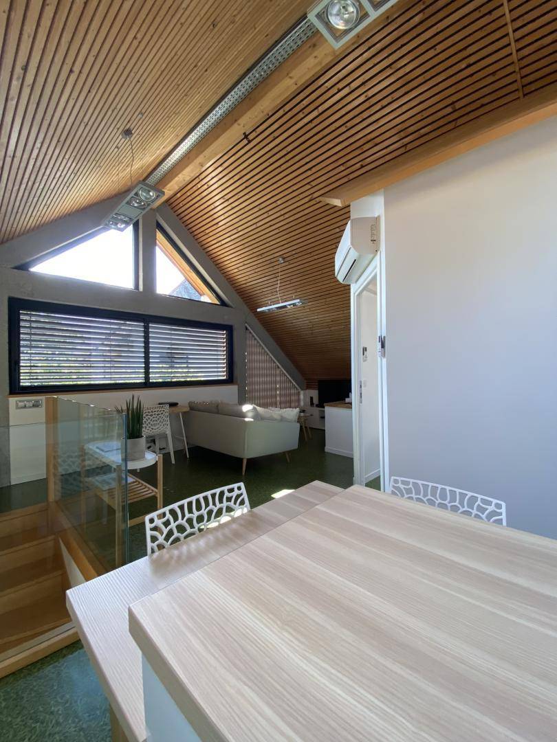 Gite in einer Doppelhaushälfte (Wohnung ganzjährig vermietet), Maisonette mit separatem Eingang. Erdgeschoss: Eingang mit Schrank, ein Badezimmer (Dusche mit WC). 1. Etage: Wohnküche mit TV-Anschluss über WLAN, Soundbar mit Bluetooth-Lautsprecher, verstellbare Sonnenschirme, ein Schlafzimmer (1 Doppelbett 160 x 200 cm). Klimaanlage. Privater Außenbereich, ausgestattet mit Gartenmöbeln.