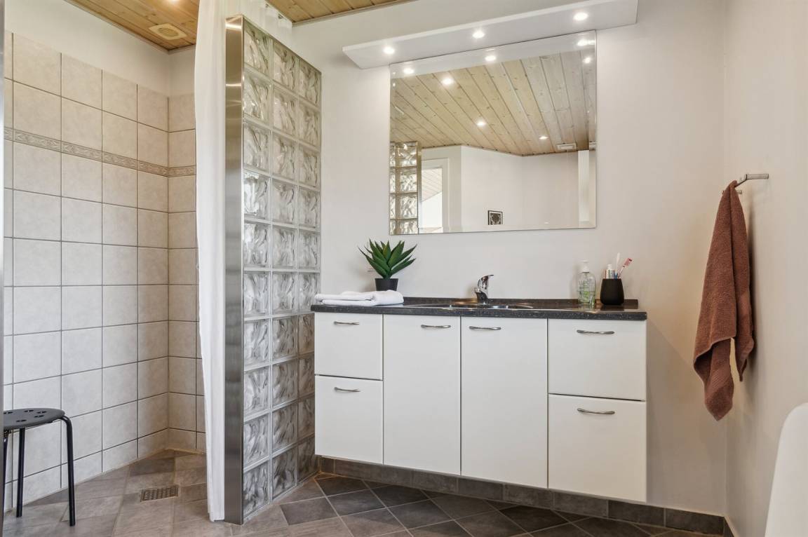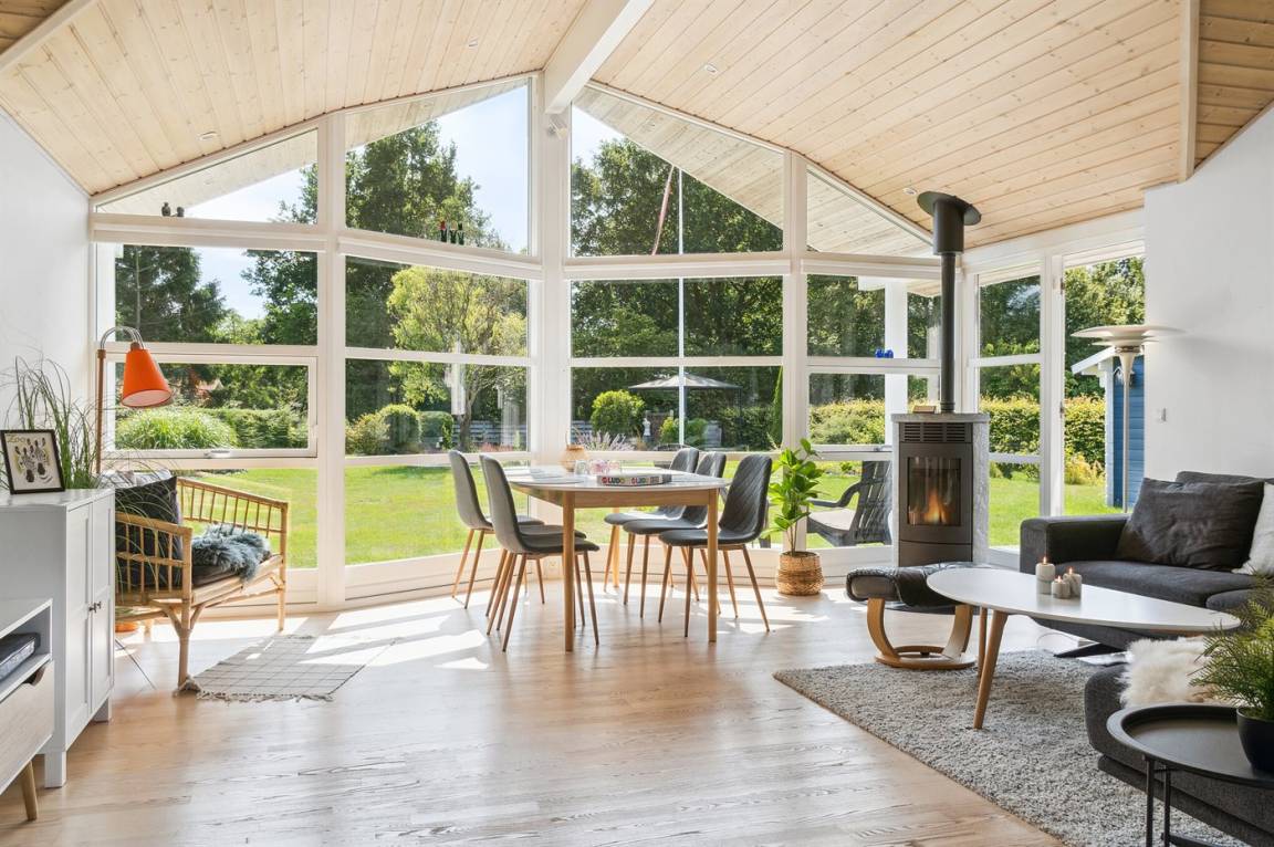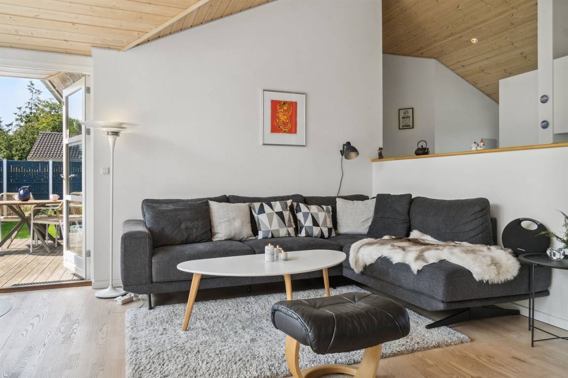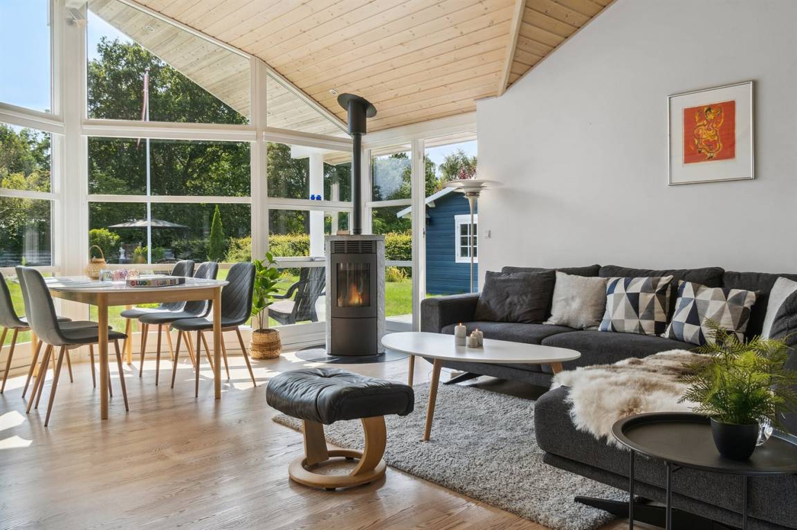 DraußenDie Ferienunterkunft liegt auf einem 1200 m² großen Naturgrundstück. Die Entfernung zum Fjord beträgt 200 m. Die nächste Einkaufsmöglichkeit liegt 3000 m entfernt. Es steht ein offenes Terrassenareal zur Verfügung. Geräteraum. Sandkasten. Trampolin.Lagerfeuerstelle. Es steht ein Grill zur Verfügung. Es steht ein Carport zur Verfügung. Parkplatz auf dem Grundstück.
