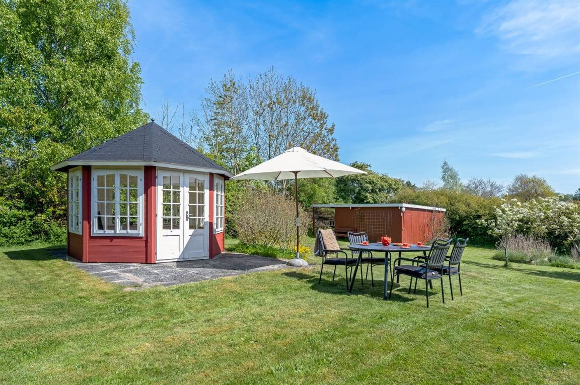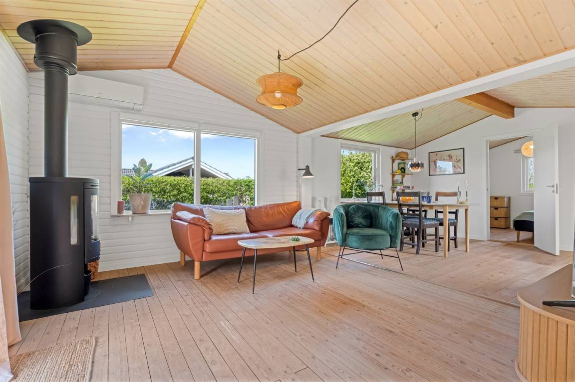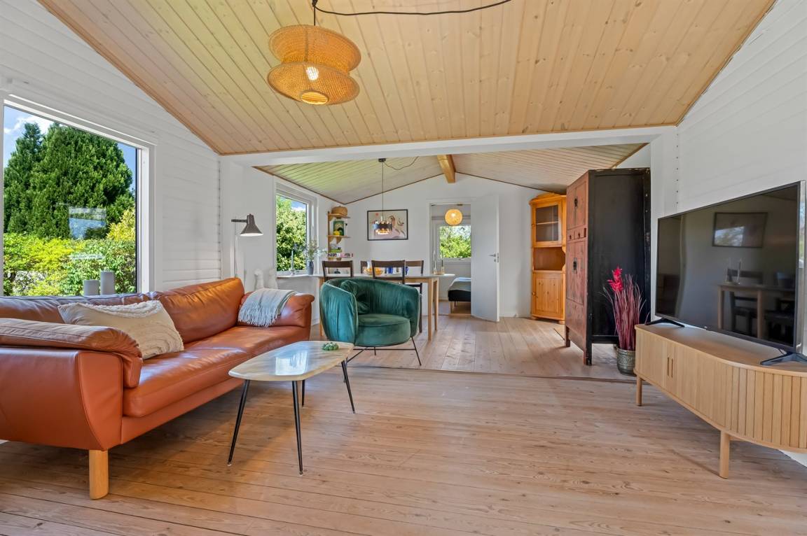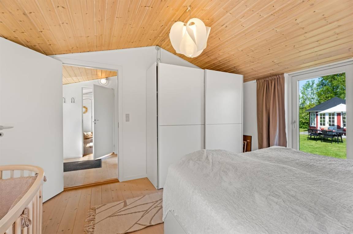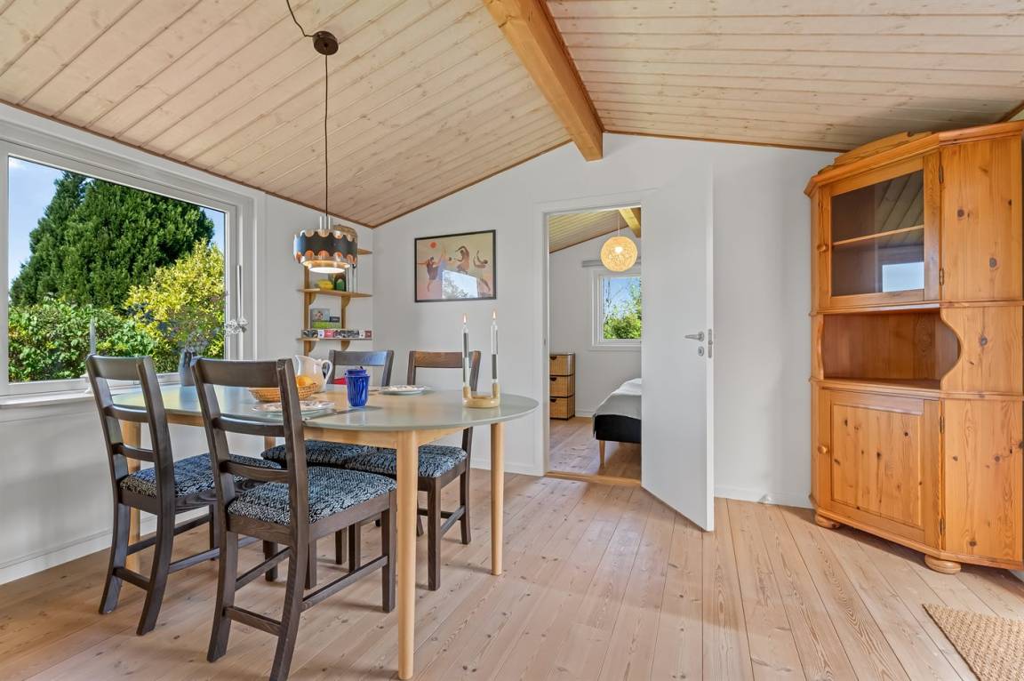 Am Ende einer kleinen, ruhigen Straße im immer schönen Bakkebølle Strand gelegen – direkt am großen geschützten Gemeinschafts- und Naturgebiet mit Wegen, die sich bis ganz ans Wasser erstrecken. Nur ein kleiner Spaziergang durch die hügelige Landschaft – etwa 700 Meter – und schon hast du die Füße im Wasser.