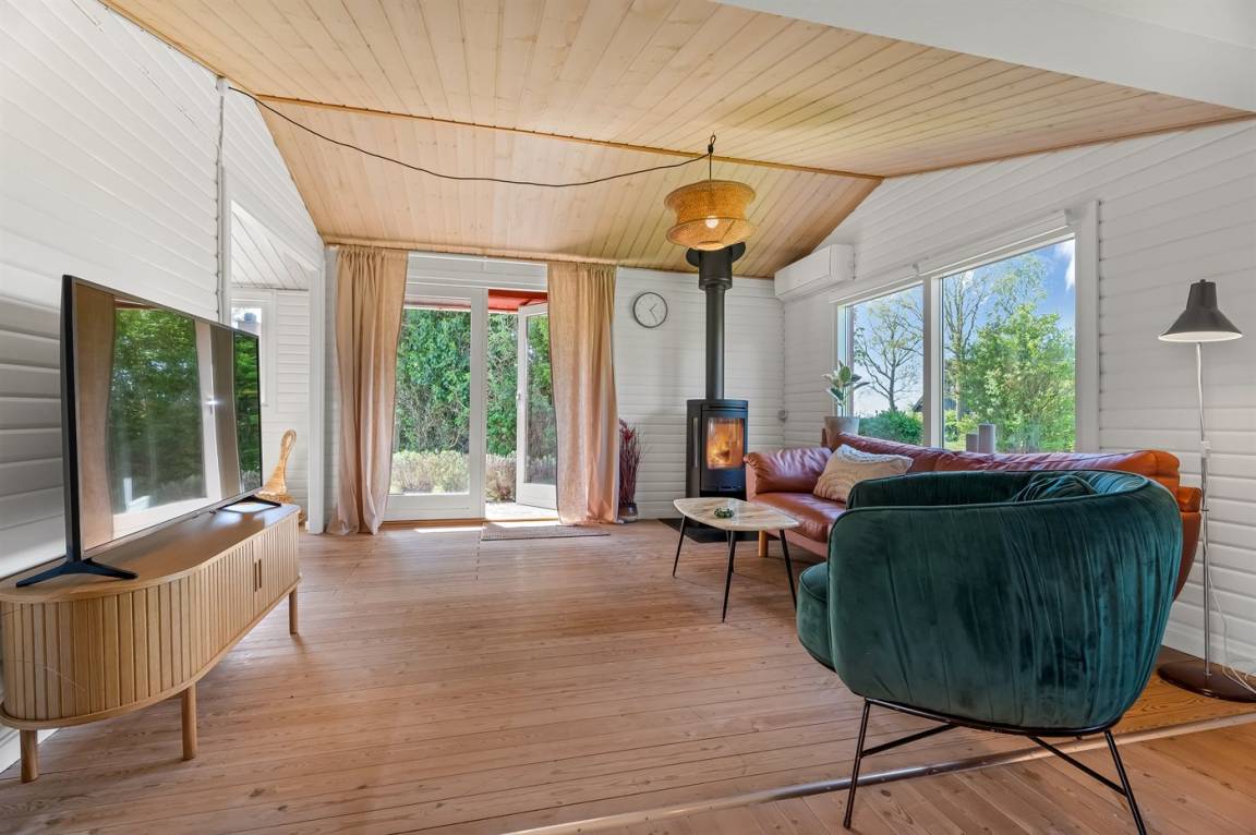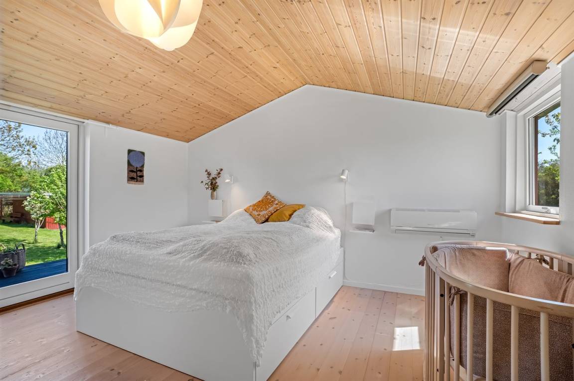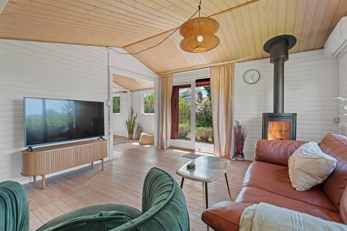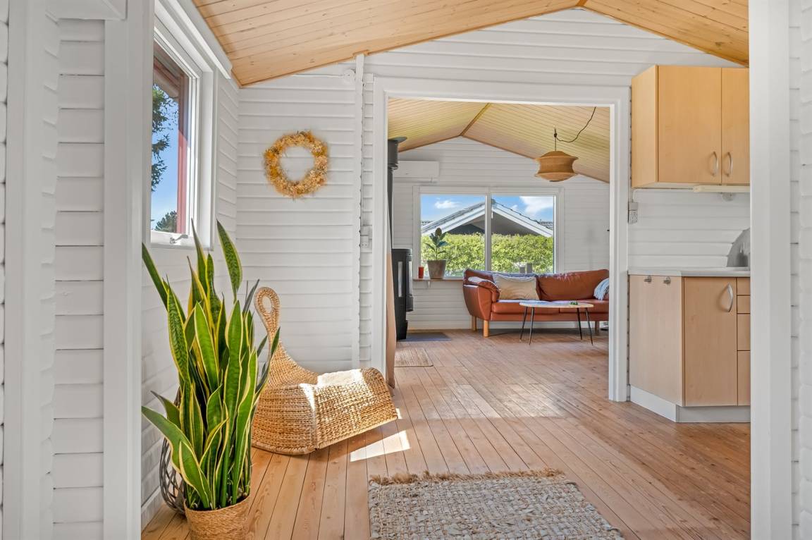 Am Ende einer kleinen, ruhigen Straße im immer schönen Bakkebølle Strand gelegen – direkt am großen geschützten Gemeinschafts- und Naturgebiet mit Wegen, die sich bis ganz ans Wasser erstrecken. Nur ein kleiner Spaziergang durch die hügelige Landschaft – etwa 700 Meter – und schon hast du die Füße im Wasser.