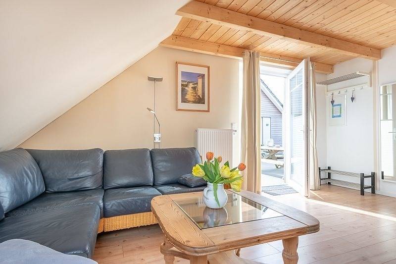 Der großzügige Wohn-/Essbereich ist gemütlich ausgestattet und bietet reichlich Platz für bis zu 4 Personen. Die integrierte Einbauküche ist komfortabel mit Ceranfeld, Backofen, Kühlschrank mit Gefrierfach, Geschirrspüler, Kaffeemaschine, Wasserkocher, Toaster und 12-fach Geschirr ausgestattet. Auf derselben Ebene befinden sich außerdem ein Schlafzimmer mit Doppelbett und ein geräumiges Duschbad mit Tageslicht. Über eine Treppe erreichen Sie ein weiteres Schlafzimmer mit Doppelbett sowie ein Schlafzimmer mit zwei Einzelbetten und ein Wannenbad mit Tageslicht. Die Wohnung ist komplett mit Laminat ausgelegt und mit Echtholzmöbeln ausgestattet. Vom Wohnzimmer und den oberen Schlafzimmern können Sie ebenfalls die Ostsee sehen.