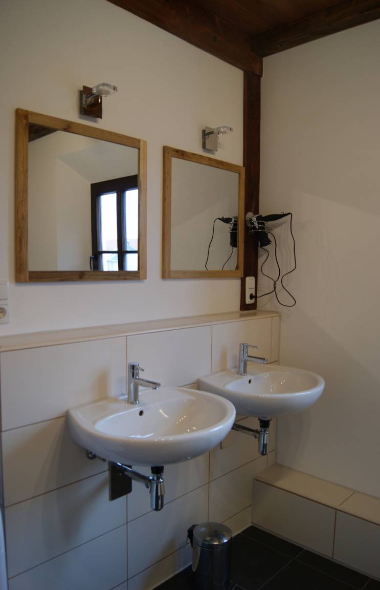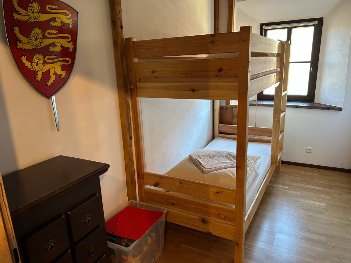 Erleben Sie Familienurlaub in der Ferienwohnung Laternenstube: 73 m², Bad, Flur, Küche, Esszimmer, Schlafzimmer mit 3,60 m Familienbett für 4 Personen und zwei Kinderzimmer mit 4 Betten. Ideal für Paare, Familien und Monteure. Im großen Park Spielplatz, Tischtennisplatte, Reckstangen, Trampolin und Großschach – Spaß für Groß und Klein.
