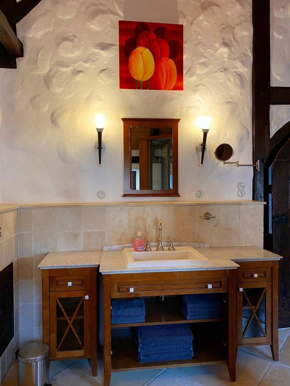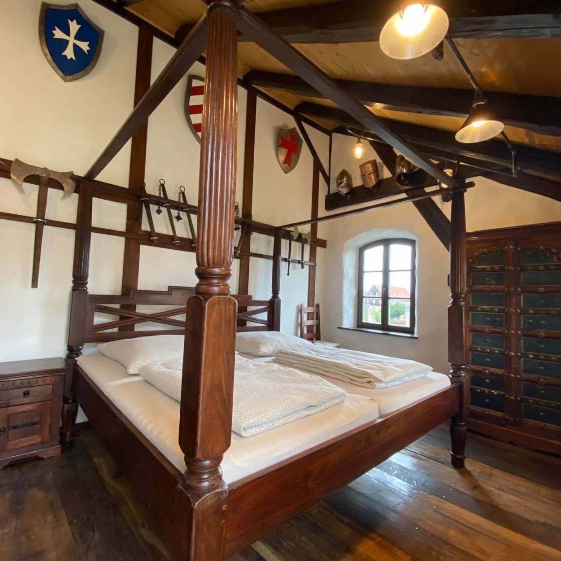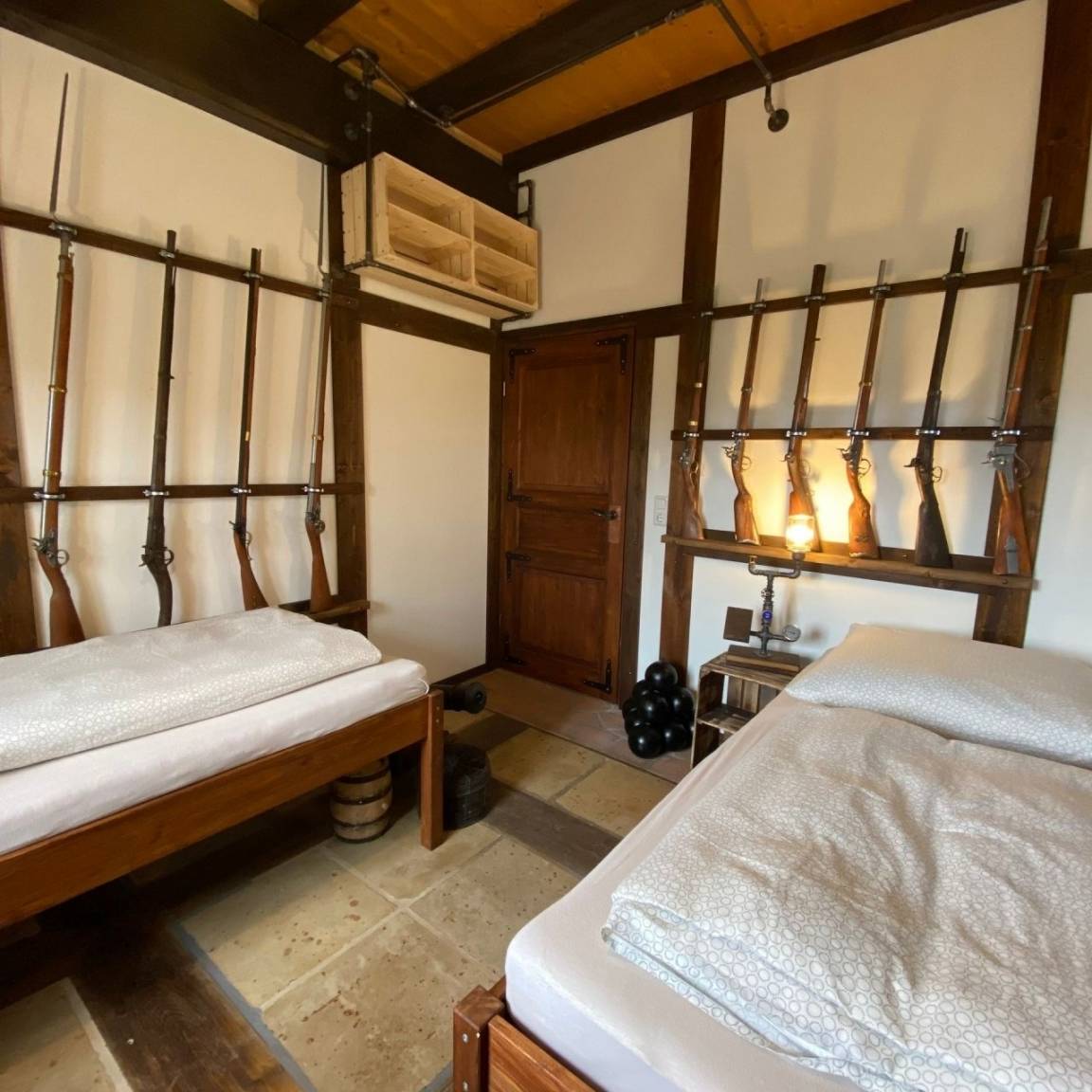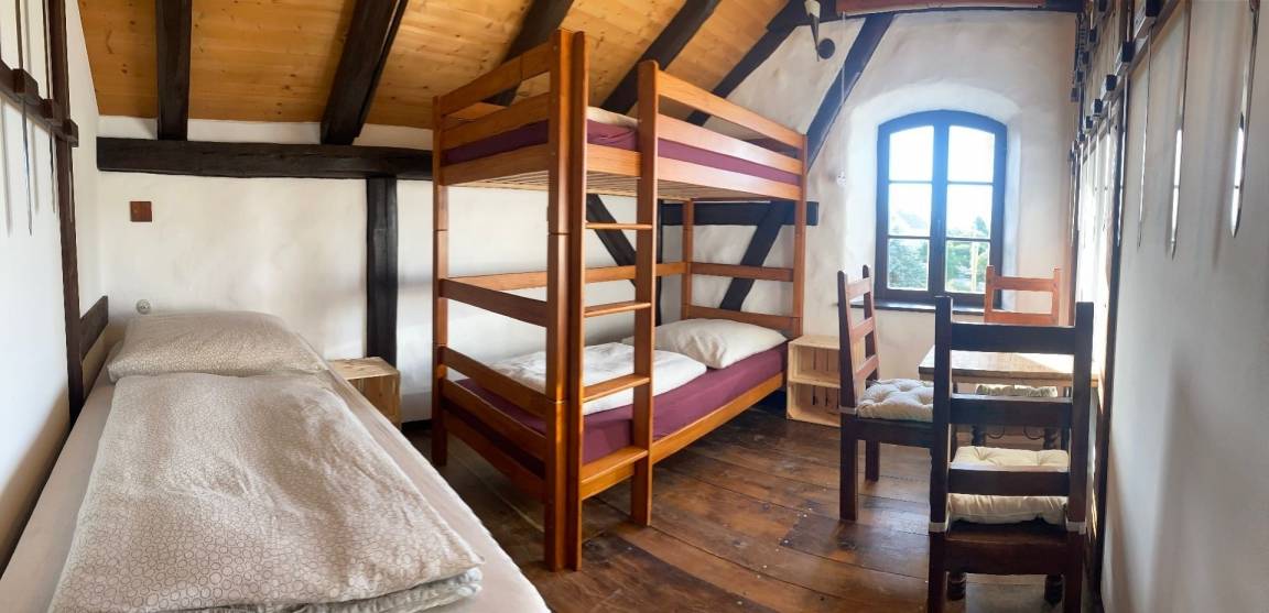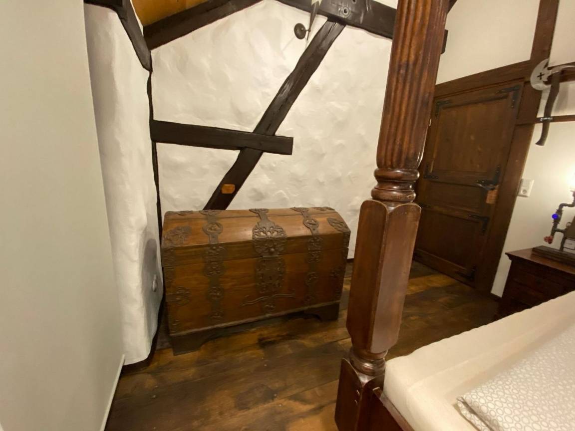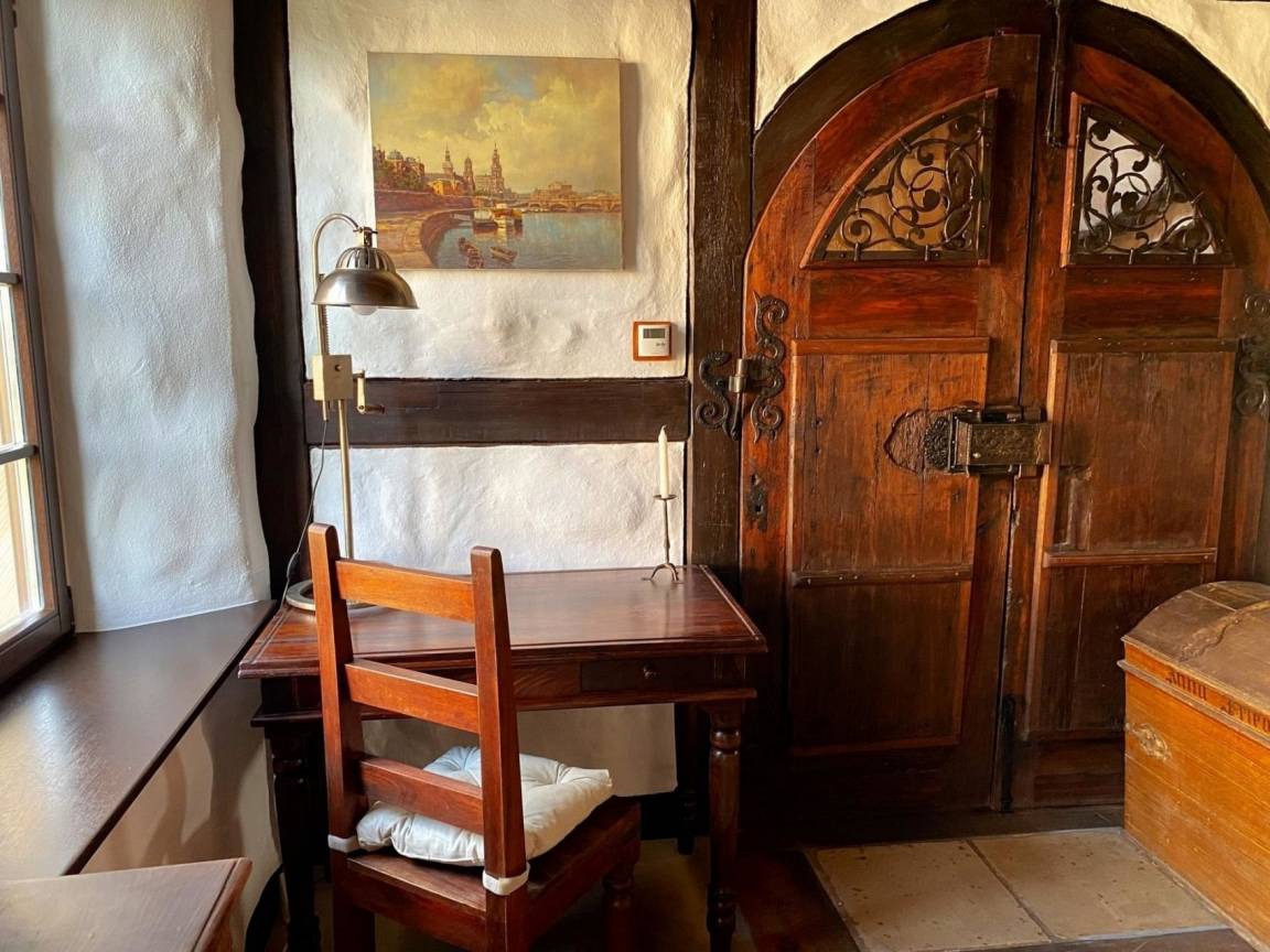 Ferienhaus WAFFENKAMMER im Rittergut Leppersdorf bei Radeberg.Unsere letzten Wachkommandanten hatten einen Faible für Waffen aller Art. Auch wenn ein Ritter natürlich nicht ohne sein Schwert aus dem Hause geht, gilt sein Interesse manchmal auch moderneren, unritterlichen Waffen wie Gewehren, Kanonen, Armbrüsten und Pistolen. Gut aufbewahrt in der Waffenkammer ist das ein imposanter Anblick. Vor allem, wenn wertvolle Stücke mit historischer Bedeutung darunter sind. Zu diesen Schätzen läßt man ungern Fremde vordringen. Deshalb liegt das Ferienhaus Waffenkammer bei uns auch direkt neben der Wachstube, verbunden durch eine Geheimtüre die nur der Kommandant und der Burgherr kennt. Da unsere Wachmannschaft gerade unterwegs ist und uns erlaubt hat, in der Wachstube ausgewählte Gäste übernachten zu lassen, habe ich dem Kommandanten auch noch die Genehmigung zur Vermietung der Waffenkammer abgerungen.Geniesen sie das einmalige Erlebnis die Nächte wohlbehütet in unserer kinderfreundlichen Waffenkammer zu verbringen.Eine 360° Ansicht finden Sie hier: Monteurswohnung gut geeignet.