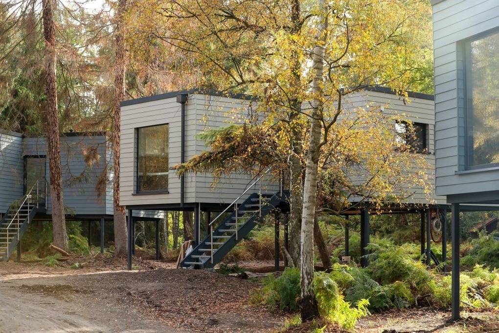 Die mit viel Liebe ausgewählten Materialien und Farben fügen sich wunderbar in das idyllische Waldbild ein. Die auf hohen Stelzen erbauten Häuser lassen Dich nachts zwischen Bäumen träumen und bieten Dir am Tage einen faszinierenden Blick in den Wald, in den Himmel und auf so manche tierischen Bewohner unseres Tierparks Ströhen.