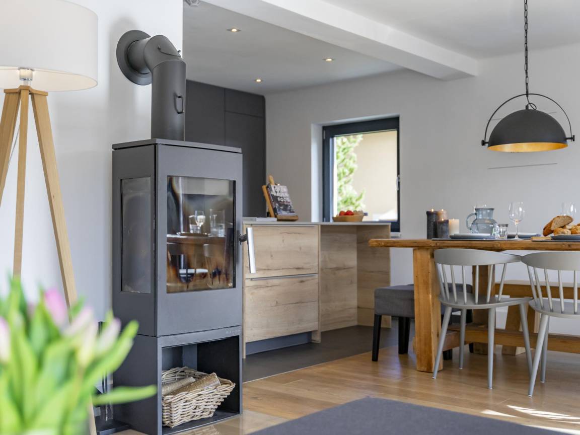 Layout : Parterre: offene Küche mit Kochherd(Induktion), Kaffeemaschine(Bohnen), Backofen, Kombi-Mikrowelle, Geschirrspüler, Kühl-/Gefrierkombination , Wohn/Esszimmer mit TV, Esstisch, Ofen, Sitzecke , Schlafzimmer mit Badezimmer mit Doppelbett, Dusche, Waschbecken, Toilette , Toilette