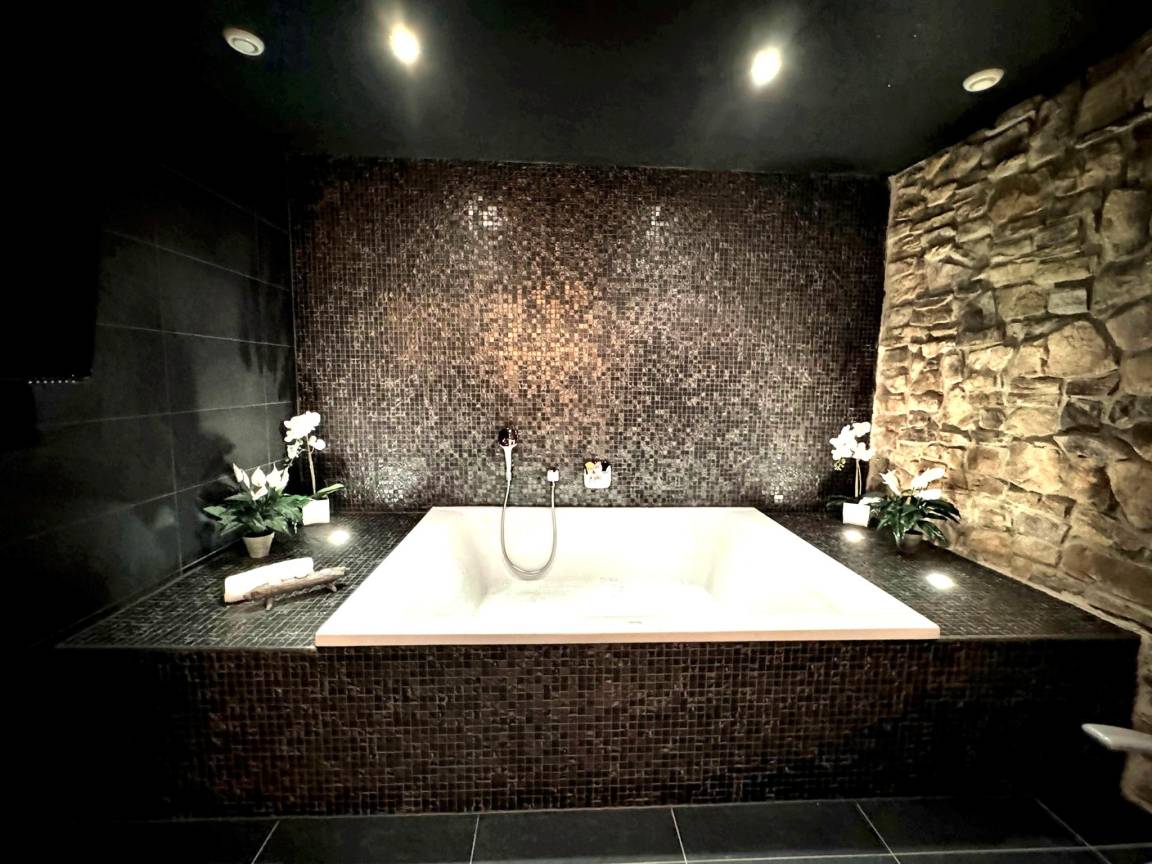 Layout : Parterre: Schlafzimmer mit Badezimmer mit Doppelbett, TV, Dusche, Waschbecken, Toilette, Föhn , Badezimmer mit TV, Badewanne, Dusche(ebenerdige Dusche), Sauna, Waschbecken, Liegestühle , Toilette, Wirtschaftsraum mit Wäschetrockner, Waschmaschine, Bügelbrett, Bügeleisen