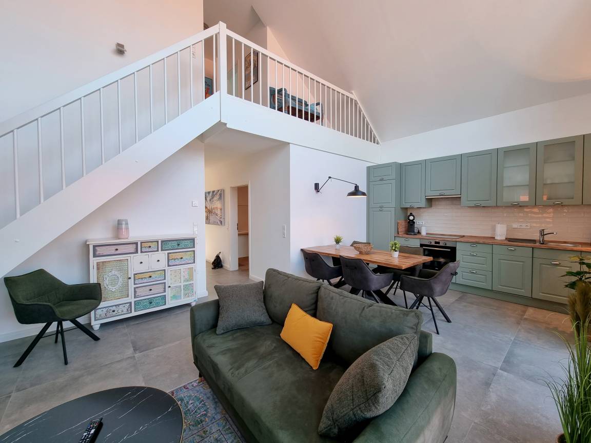 Das Ferienhaus ist sehr ansprechend in der Ausstattung sowie im Urlaubsflair. Von der Empore im Wohnzimmer hat man einen phantastischen Blick durch das tolle Oberfenster mit Teilblick auf den Hafen.