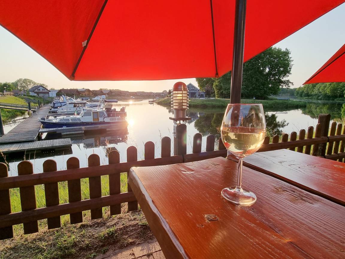 Von der Terrasse aus können Sie eingeschränkt noch bis in das Hafenbecken mit seinen Sportbooten schauen sowie auch gegenüber zur Ems, wo Frachtschiffe und mehr zu sehen sind.