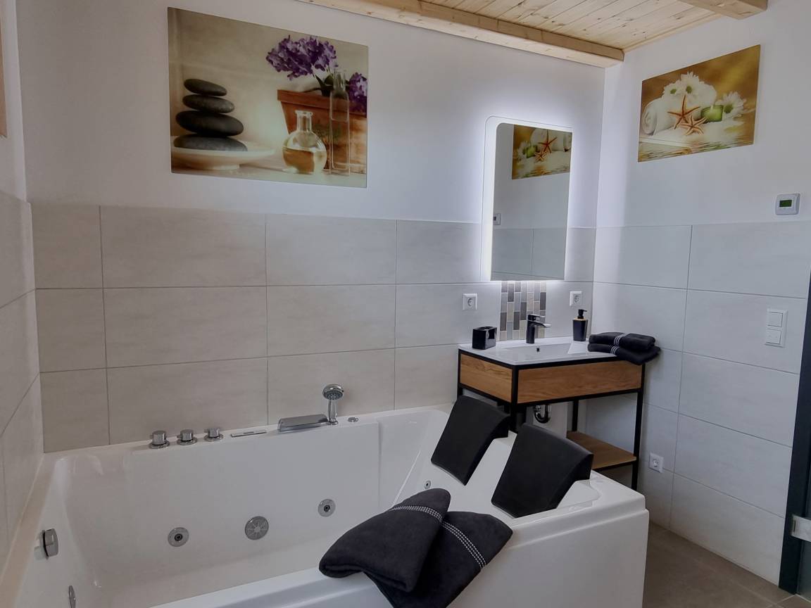 Relaxen Sie im Ferienhaus im eigenen Wellness-Bereich: Finnische Sauna und toller großer Whirlpool für 2 Personen! Anschließend im Relaxsessel eine Massage genießen und in den flackernden Elektrokamin schauen bzw ins Fernsehen ... Auch eine interessante Buchbibliothek wartet hier auf Sie.