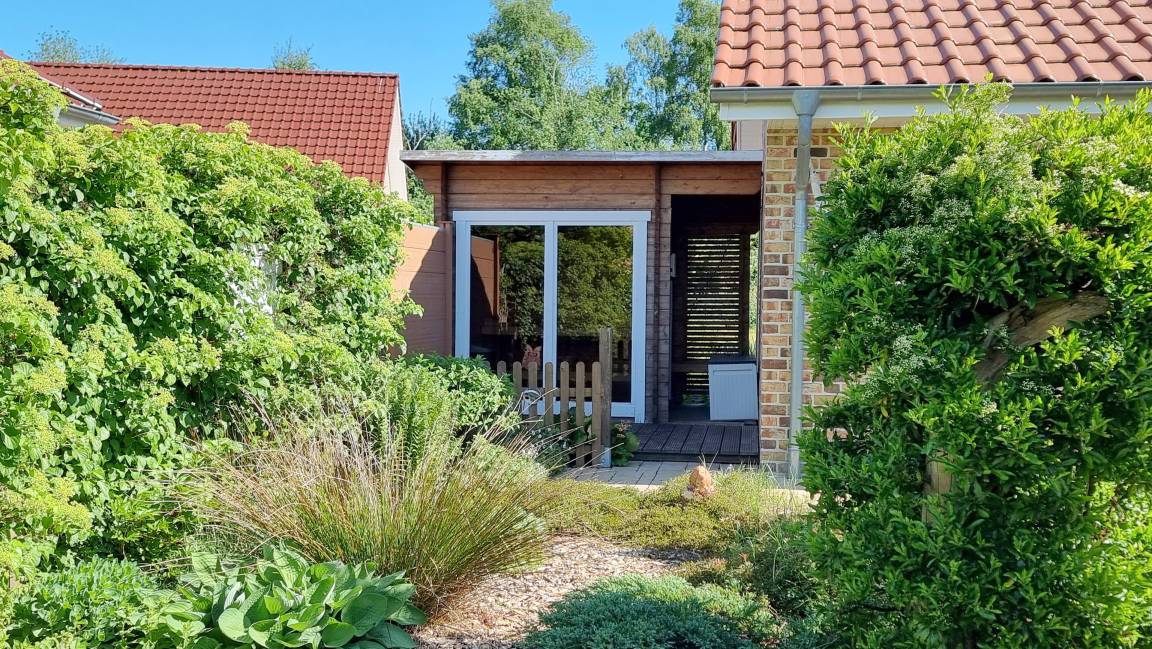 Das ebenerdige Ferienhaus verfügt über ein großes Wohnzimmer mit Essbereich und offener Küche. Vom Wohnzimmer aus schauen Sie in den Staudengarten mit Pavillon.