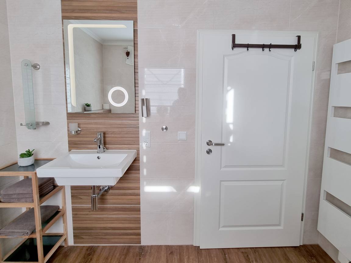 Das mediterrane Bad verfügt über eine Dusche mit weit öffnenden Glastüren. Am Boden befindet sich nur eine kleine Schwelle.