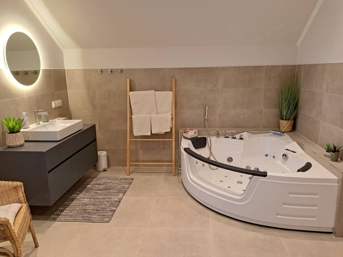 Das Wellness-Bad im OG ist mit einer schönen Eck-Whirlwanne ausgestattet sowie einer Infrarotsauna. Hier können Sie relaxen und sich entspannt von Alltag erholen.