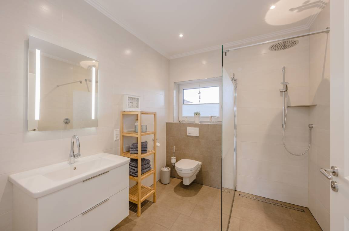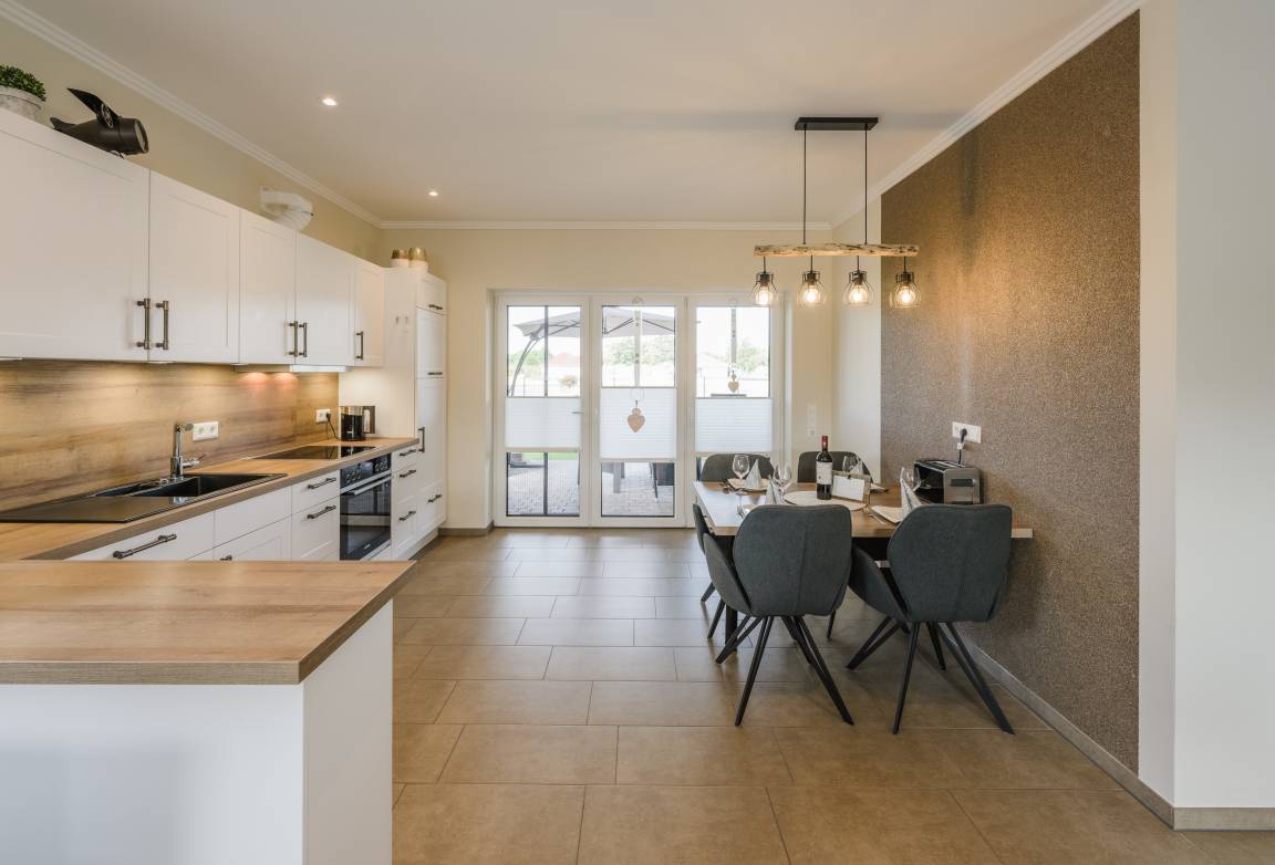 Im Inneren erwartet Sie eine moderne, hochwertige Einrichtung, ebenso haben wir auf Barrierefreiheit geachtet. Unter anderem sind die Eingänge mit einer niedrigen Schwelle versehen, alle Innentüren ein Meter breit und die Dusche ebenerdig ausgeführt. Über das Wohn-/ Esszimmer erreichen Sie den großzügigen Terrassenbereich, von dem Sie einen wunderschönen Blick auf den See genießen können.