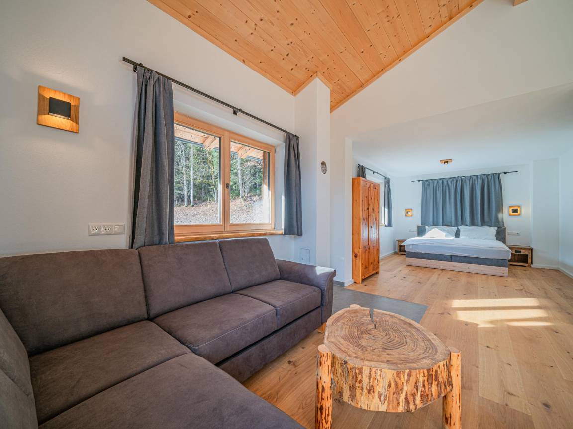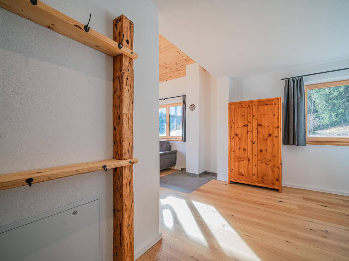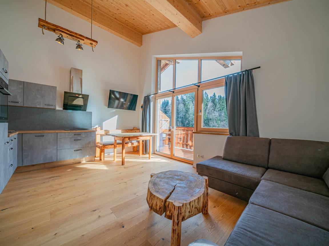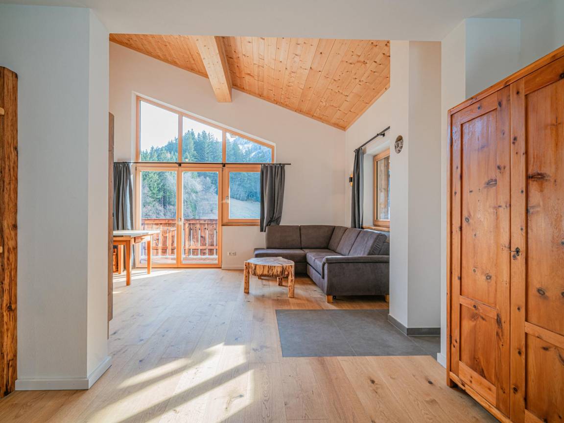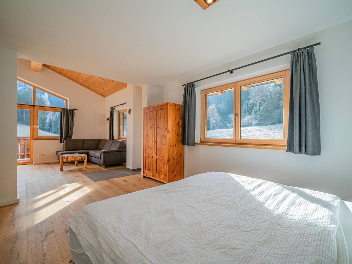 Hausbeschreibung : Diese charmante Ferienwohnung überzeugt mit einem besonderen Grundriss und alpinem Wohnflair. Eines der beiden Schlafzimmer liegt direkt neben der Wohnung – mit eigenem Bad, Balkonzugang und viel Privatsphäre. Das zweite Doppelbett ist offen in den Wohnbereich integriert, als großzügige Schlafnische ohne Tür. Eine moderne Küche, zwei Bäder, TV und ein herrlicher Ausblick machen das Urlaubsgefühl komplett