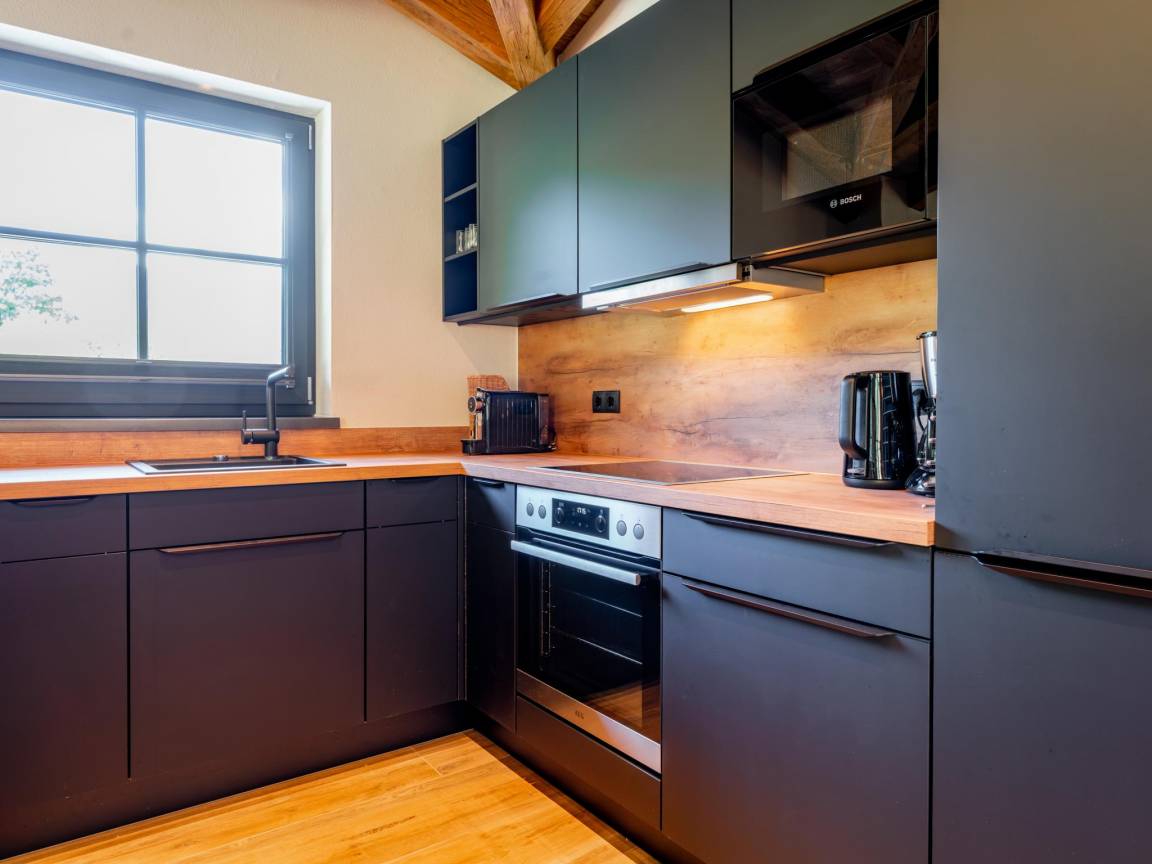In der 1. Etage: offene Küche mit Wasserkocher, Kochherd(4 Kochplatten), Kaffeemaschine(cups, Filter), Backofen, Geschirrspüler, Kühl-/Gefrierkombination , Wohn/Esszimmer mit TV(smart TV), Esstisch, Sitzecke , Schlafzimmer mit Badezimmer mit Doppelbett, Dusche, Waschbecken, Toilette , Balkon