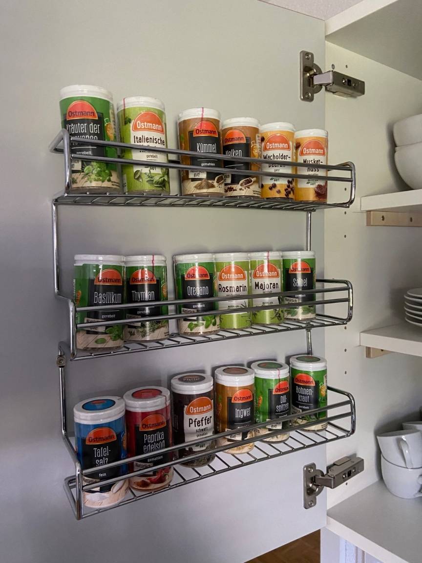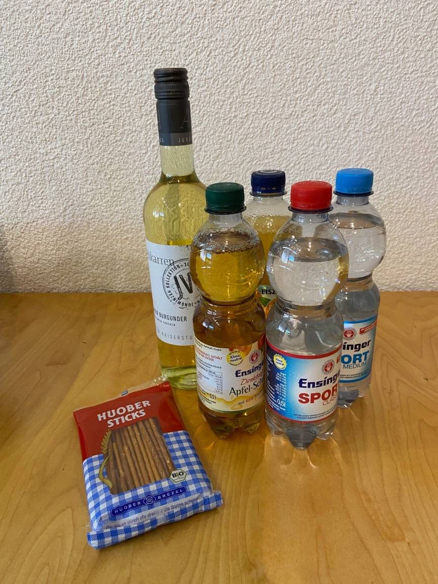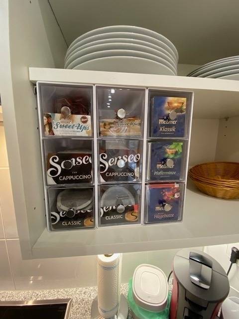 Begrüßungsgetränke im Kühlschrank und Salzgebäck, Kaffeepads drei Sorten, Tee drei Sorten Zucker + Kaffee Milch sowie Gewürze im Regal sind direkt in den Oberschränken