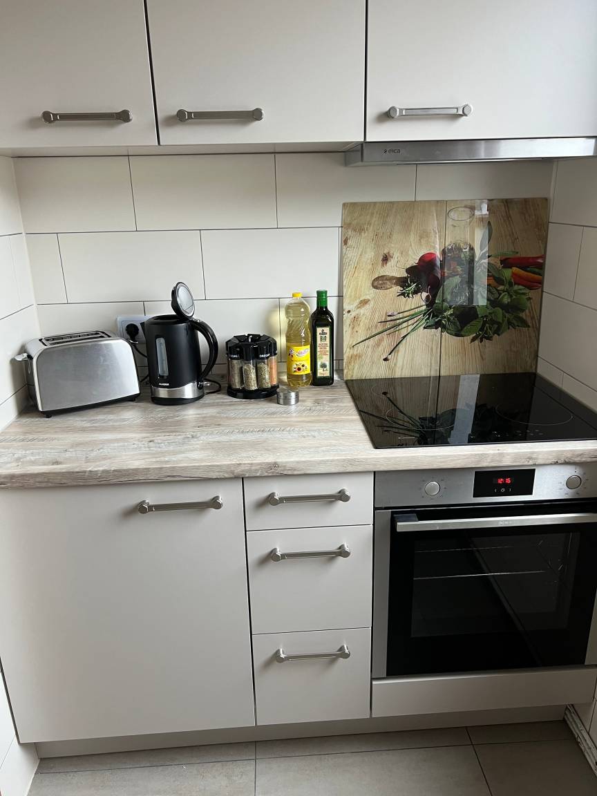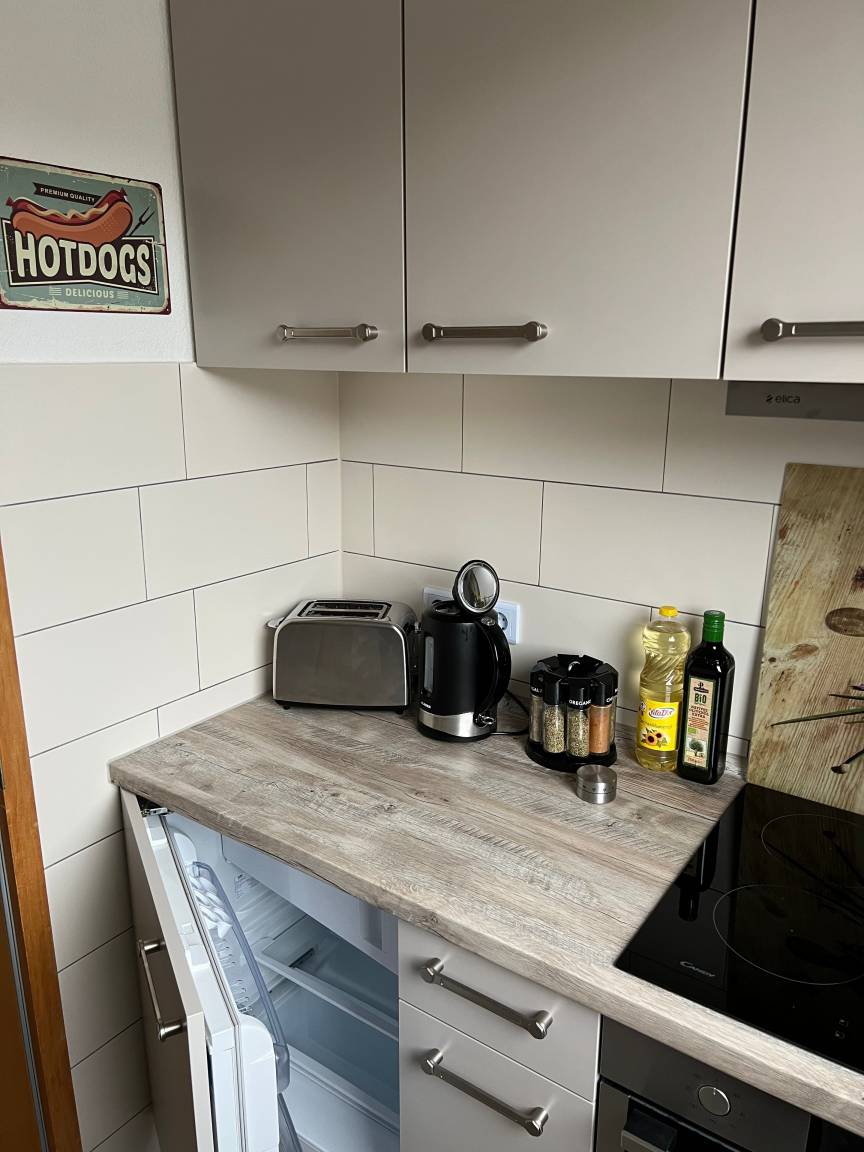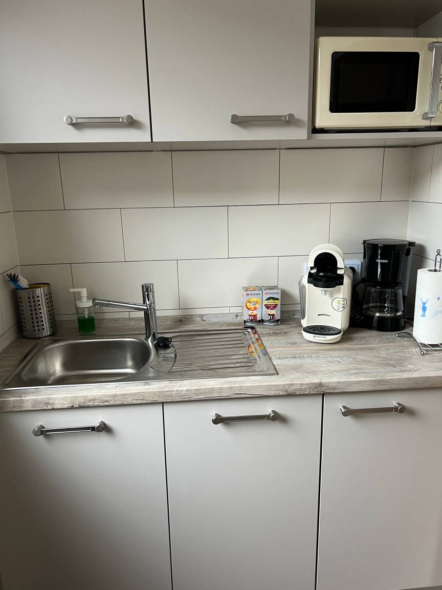 Richtige Urlaubsstimmung kommt auf der schönen Terrasse der Ferienwohnung auf. In der gut ausgestatteten Küche finden Sie neben einem Kühlschrank auch eine Mikrowelle und einen Backofen.