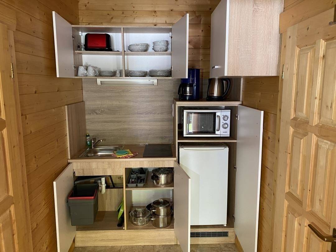 Die kleine Küche ist ausgestattet mit einem Kühlschrank, zwei Herdplatten, einer Mikrowelle und einer Spüle. Kochutensilien sowie Geschirr stehen zur Verfügung.