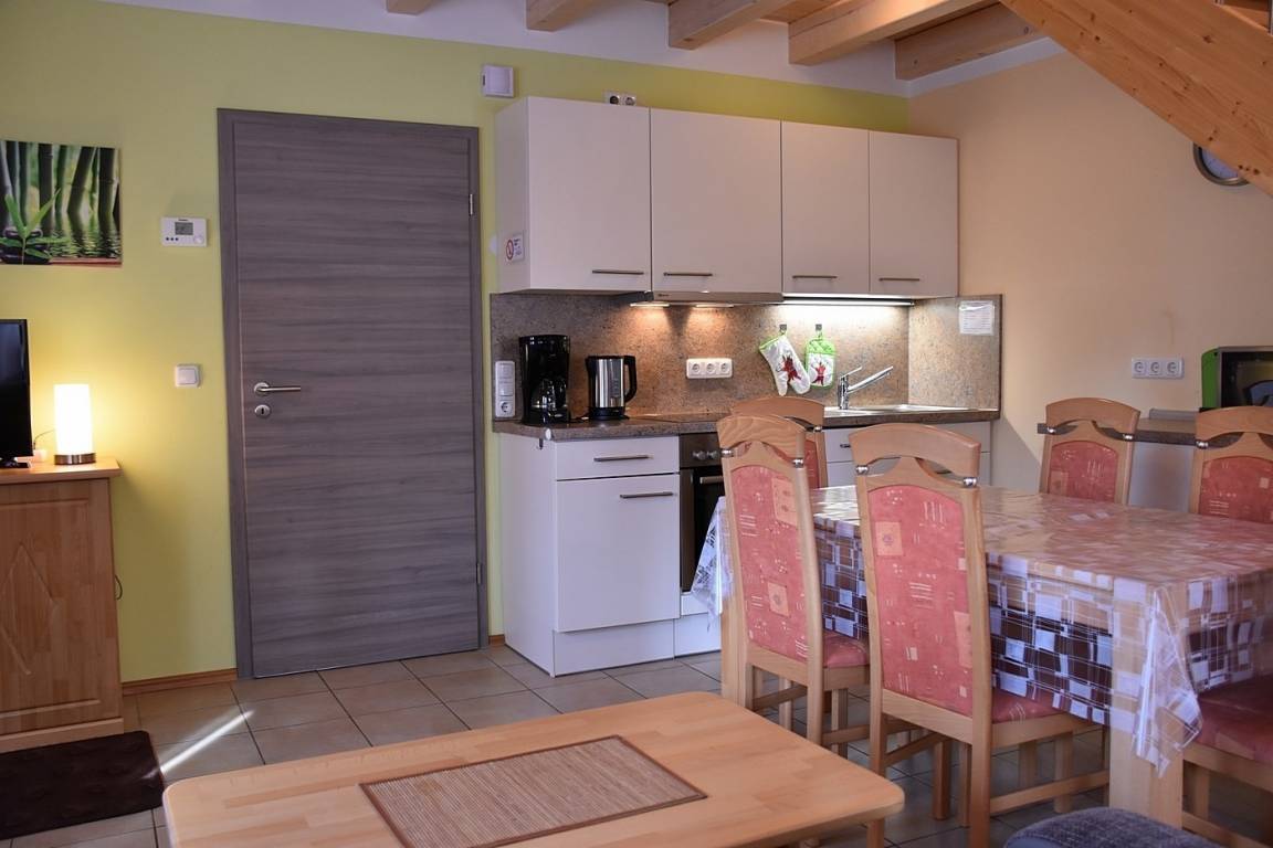 Im EG: Wohnschlafraum mit Polstersitzgruppe (mit DB-Schlafcouch), Farb-TV, Essplatz für 4 Personen, Küchenzeile mit E-Herd (Backrohr, Wasserkocher, Toaster und Kaffeemaschine),
