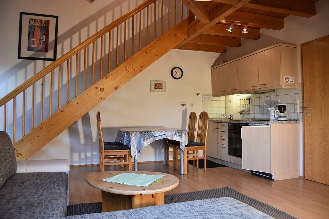 Im EG: Wohnschlafraum mit Polstersitzgruppe (mit DB-Schlafcouch), Farb-TV, Essplatz für 4 Personen, Küchenzeile mit E-Herd (Backrohr, Wasserkocher, Toaster und Kaffeemaschine),