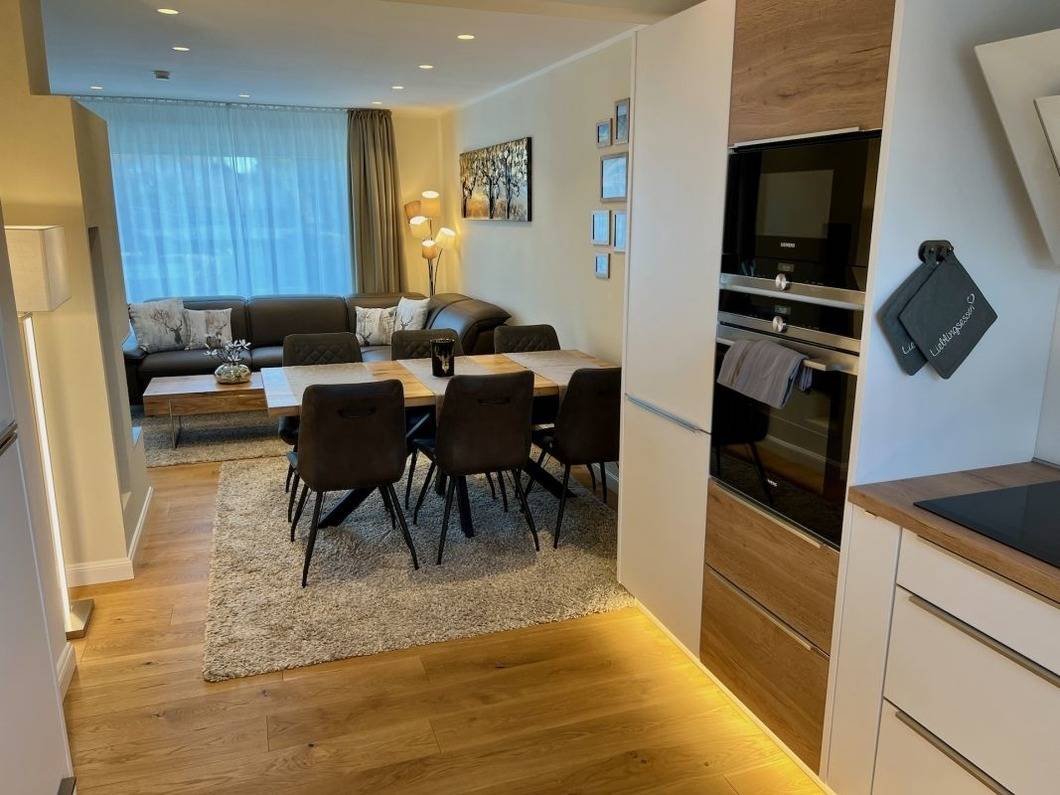 Den Feriengästen stehen mehrere Parkplätze direkt vor und neben dem Haus zur Verfügung. Beim Eintreten in das neue Feriendomizil führt der Weg durch einen kleinen Flur direkt zur Eingangstür der Wohnung 1. Nachdem man die Wohnung betreten hat, gelangt man direkt in die luxuriöse und moderne Küche, wo Sie bei einem Glas Sekt oder Tässchen Kaffee zunächst einmal ankommen können.