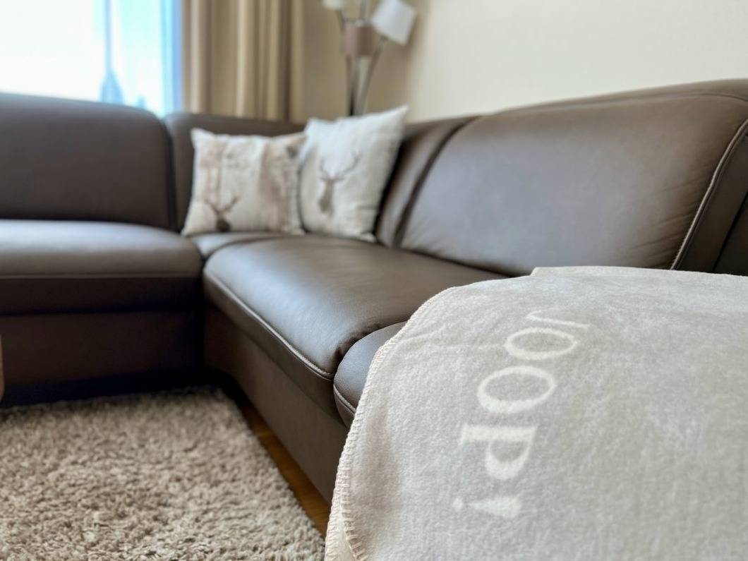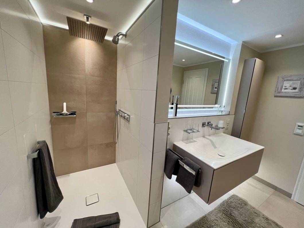 Das Badezimmer mit Dusche und WC ist modern und luxuriös ausgestattet. Fußbodenheizung und verschiedene Lichteffekte runden den entspannenden Effekt ab. Relaxen Sie bei einer heißen Regen-Dusche nach einem langen Wandertag oder genießen Sie einfach die Ruhe des Hauses und seiner Umgebung.