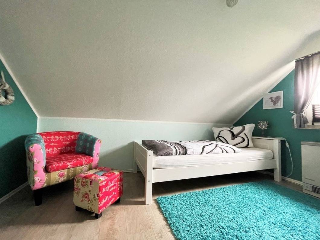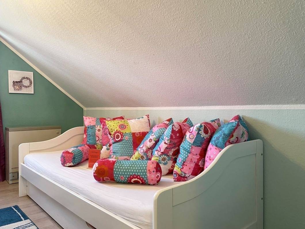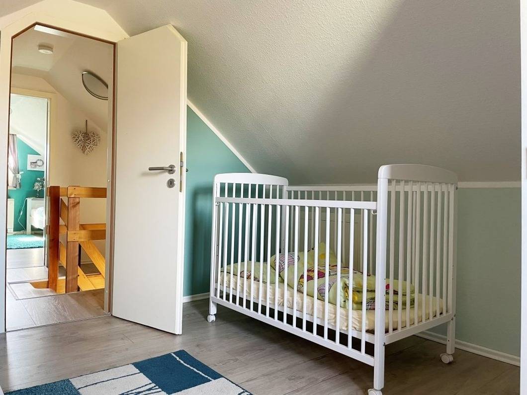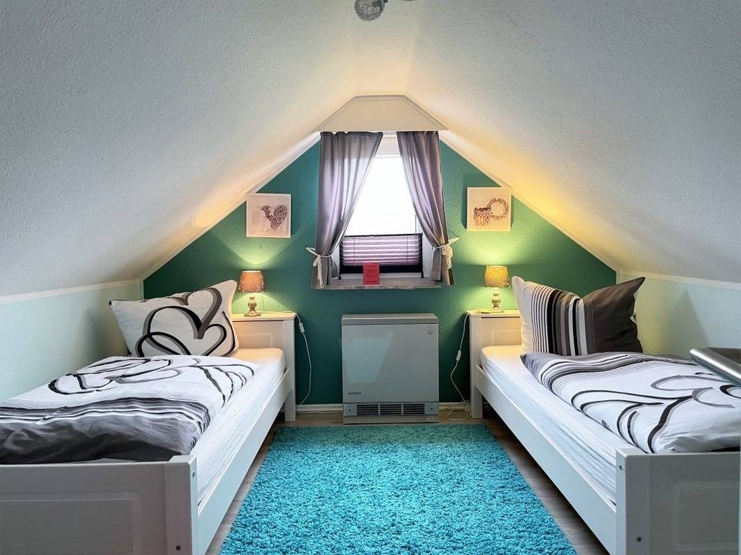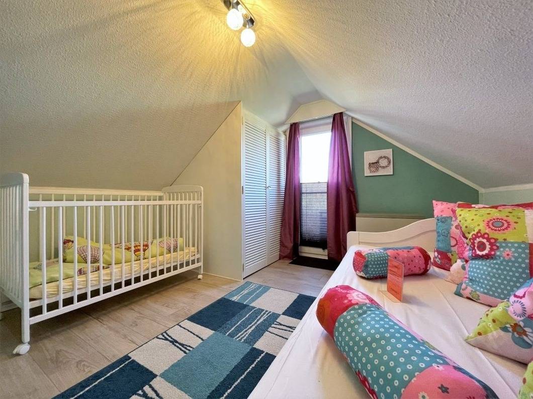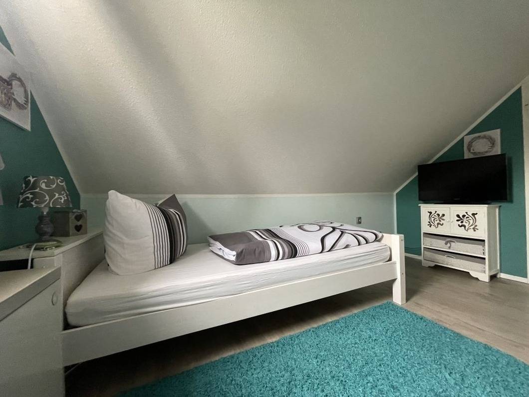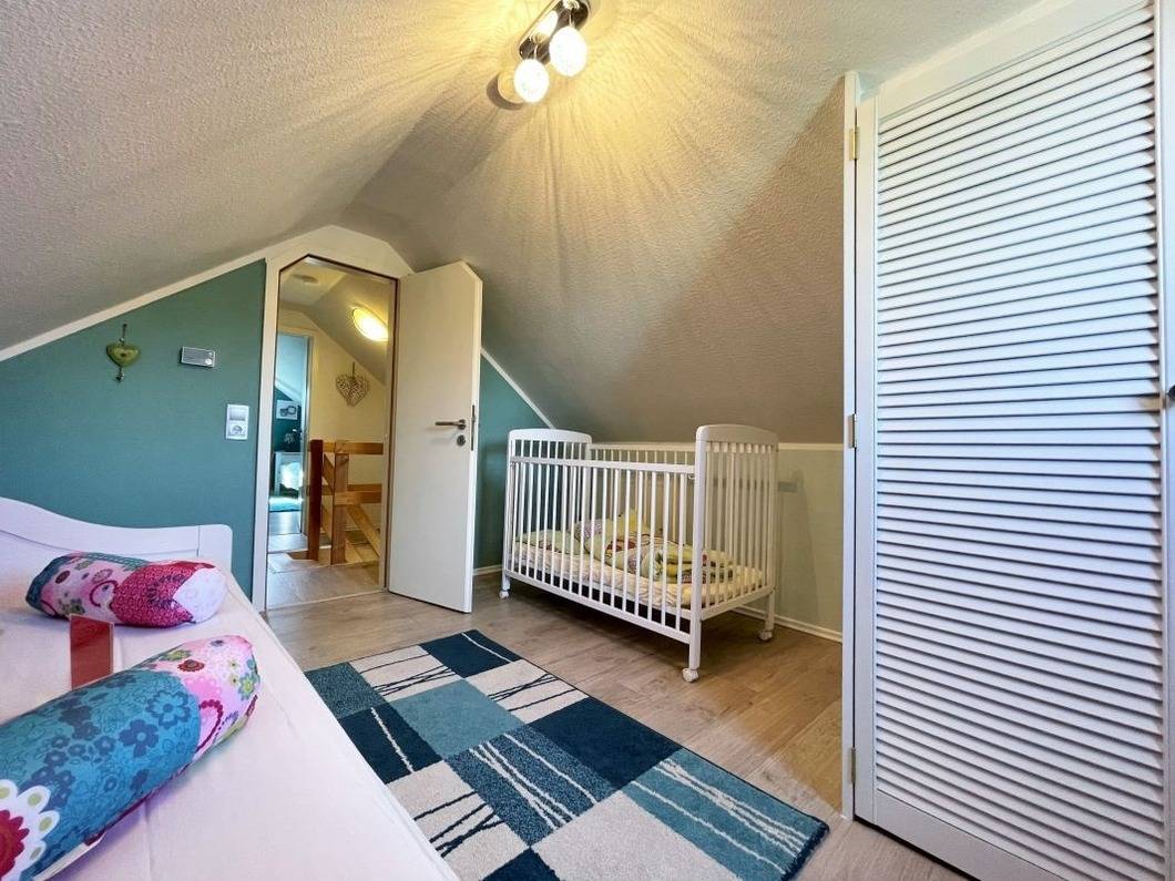 Die beiden anderen Schlafzimmer befinden sich im ausgebauten Dachgeschoss. Das erste Schlafzimmer verfügt über 2 Einzelbetten und einen zusätzlichen Flat-TV. Im zweiten Schlafzimmer finden SIe ein Einzell- und ein Kinderbett, dieses Schlafzimmer hat einen direkten Zugang zum Balkon.