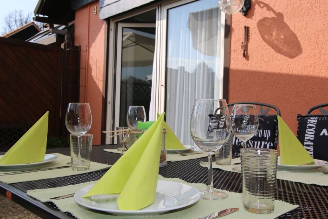 Das Wohn- und Esszimmer verfügt über einen direkten Zugang zur Terrasse und dem eingezäunten Garten. Es ist mit einer großen Couch und Sesseln, Flat-TV mit Sat-Anschluss, Radio und CD/DVD Player ausgestattet. Angrenzend befindet sich ein Esstisch für 5 Personen.