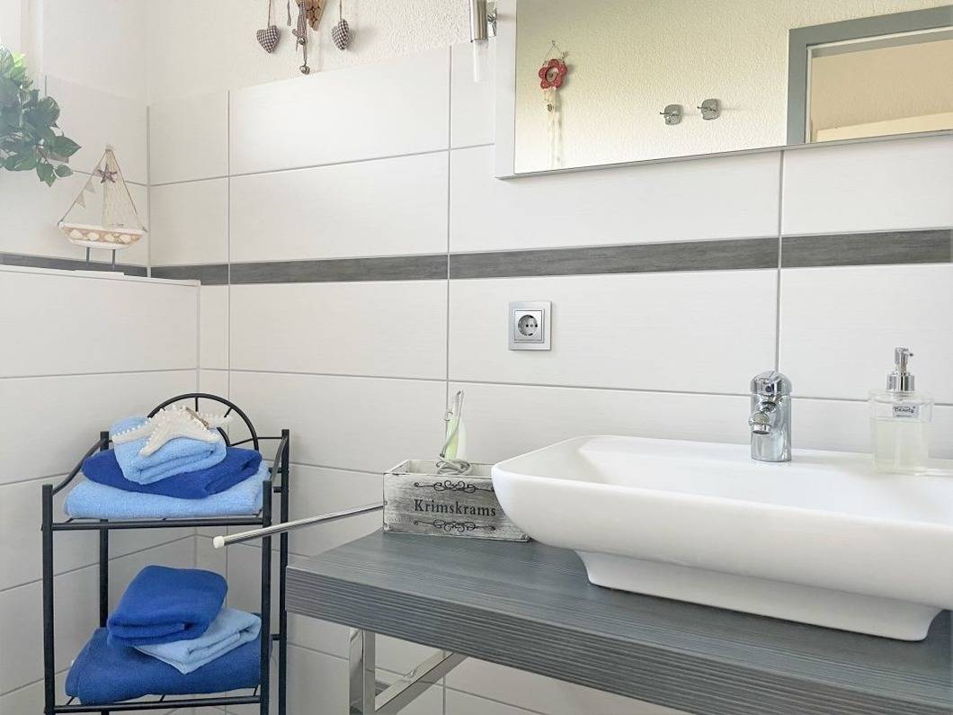 Das Badezimmer ist modern gestaltet und verfügt über eine große Echtglasdusche.