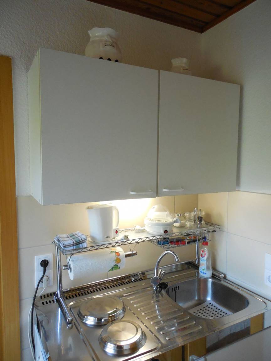 Eine Miniküche mit Kühlschrank, zwei Kochplatten, Toaster, Kaffemaschine, Besteck sowie Geschirr ist vorhanden. Das Bad ist mit Dusche, Haartrockner und WC ausgestattet.