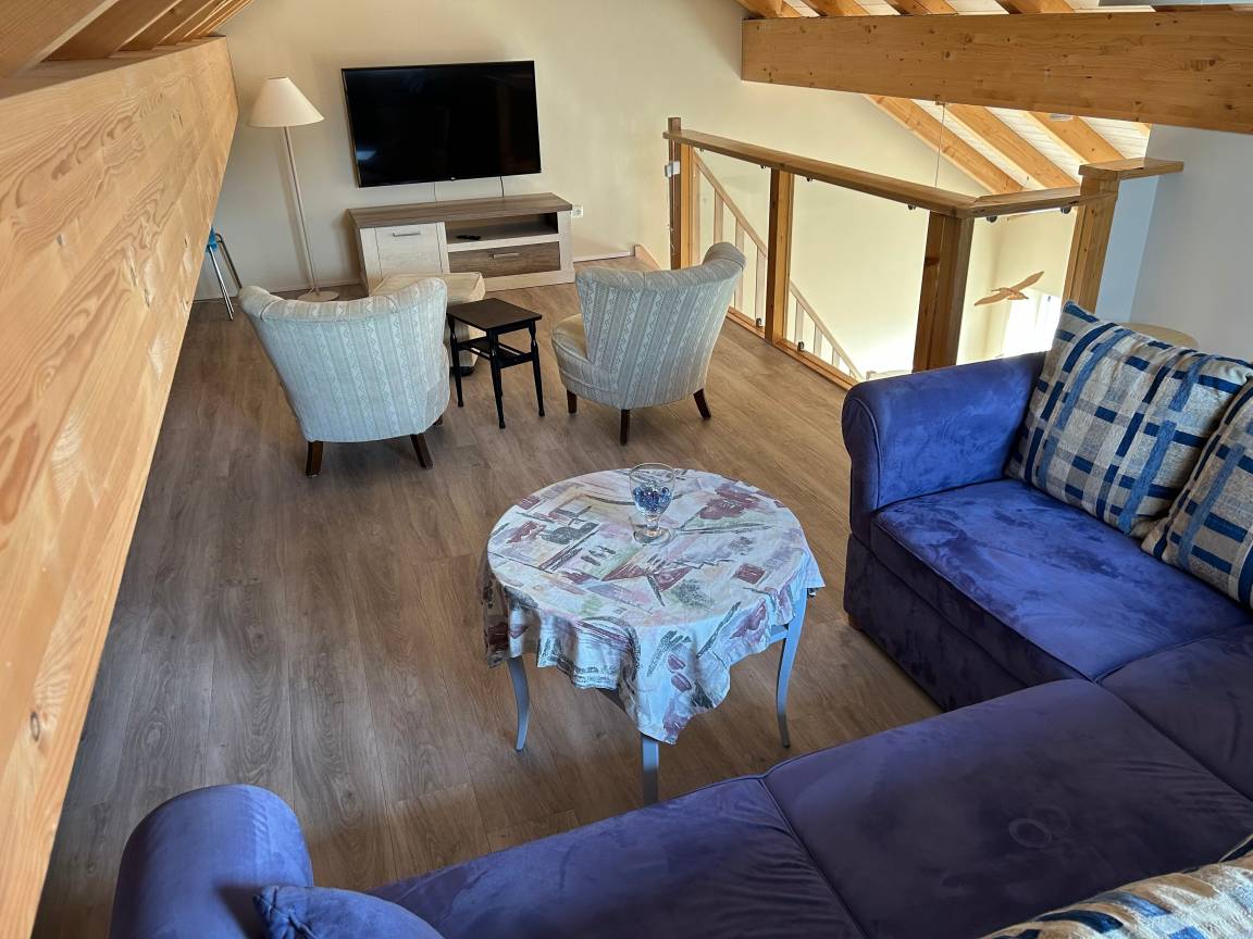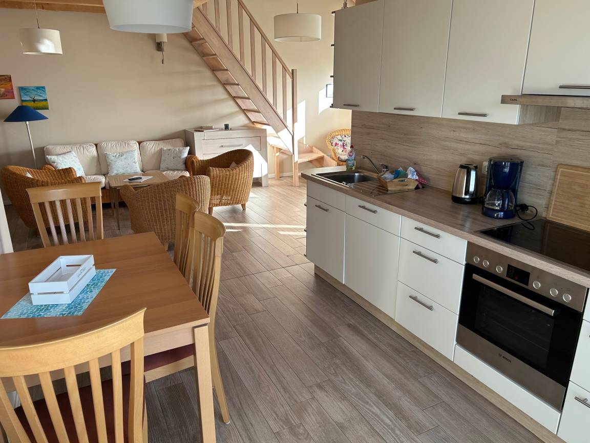 Das WZ ist mit einer offenen gut ausgestatteten Küche und einer Couchgarnitur mit Ofen eingerichtet. Vom WZ gehen Sie rechts in einen weiteren Schlafraum mit 2 Einzelbetten. Über eine Treppe gelangen Sie ins Obergeschoß.