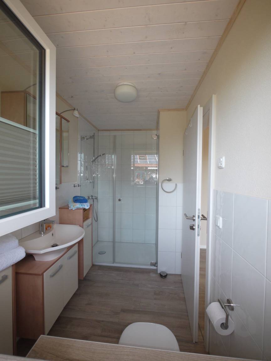 Über einen eigenen Eingang gelangen Sie in die Doppelhaushälfte und kommen über einen kleinen Flur links ins Duschbad, rechts in ein Schlafzimmer mit Ehebett und geradeaus ins