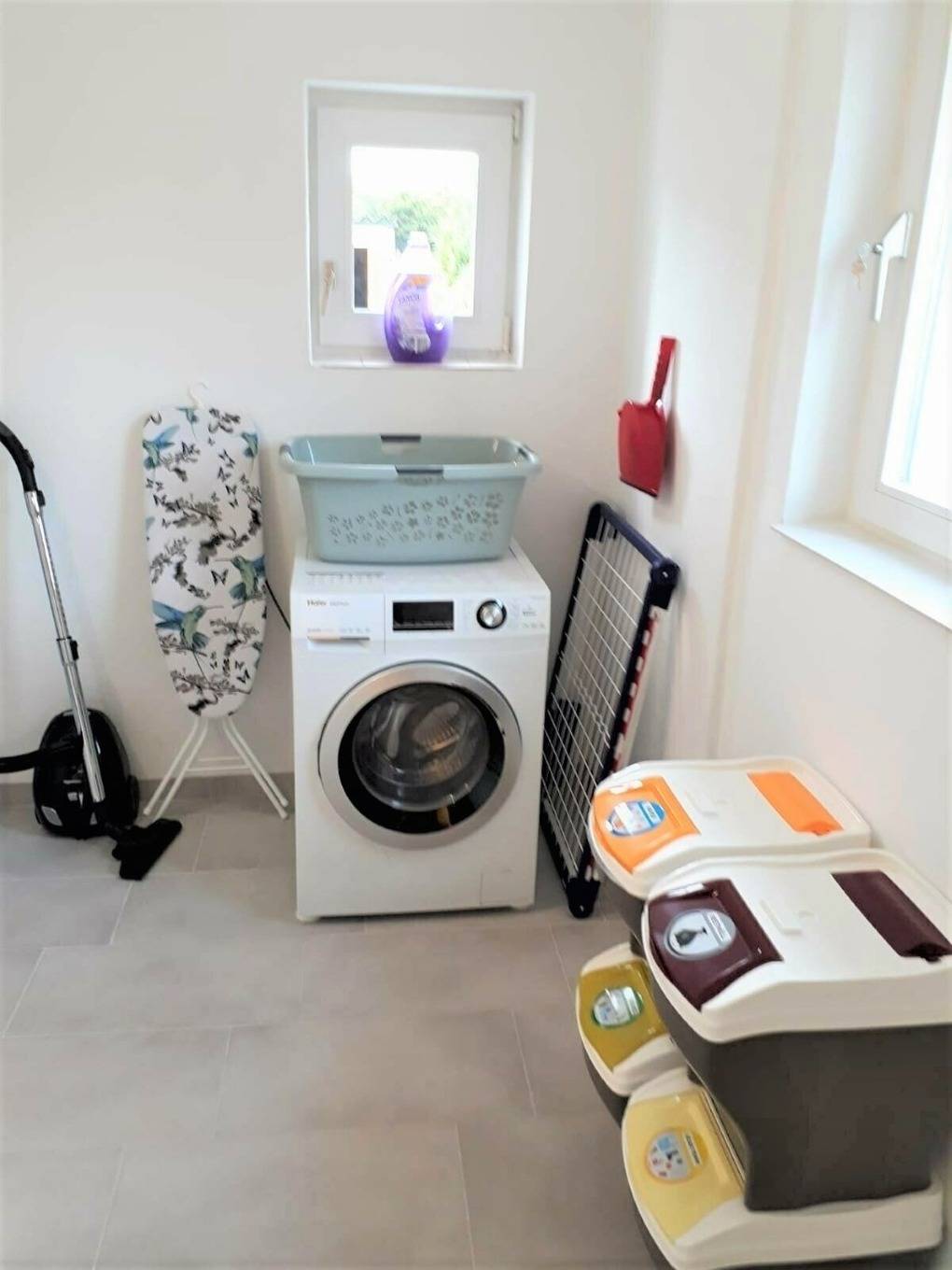 Ein Hauswirtschaftsraum mit Waschmaschine, Bügelbrett, Wäscheständer und Staubsauger und genügend Platz, um einige Dinge einfach weg zu stellen.