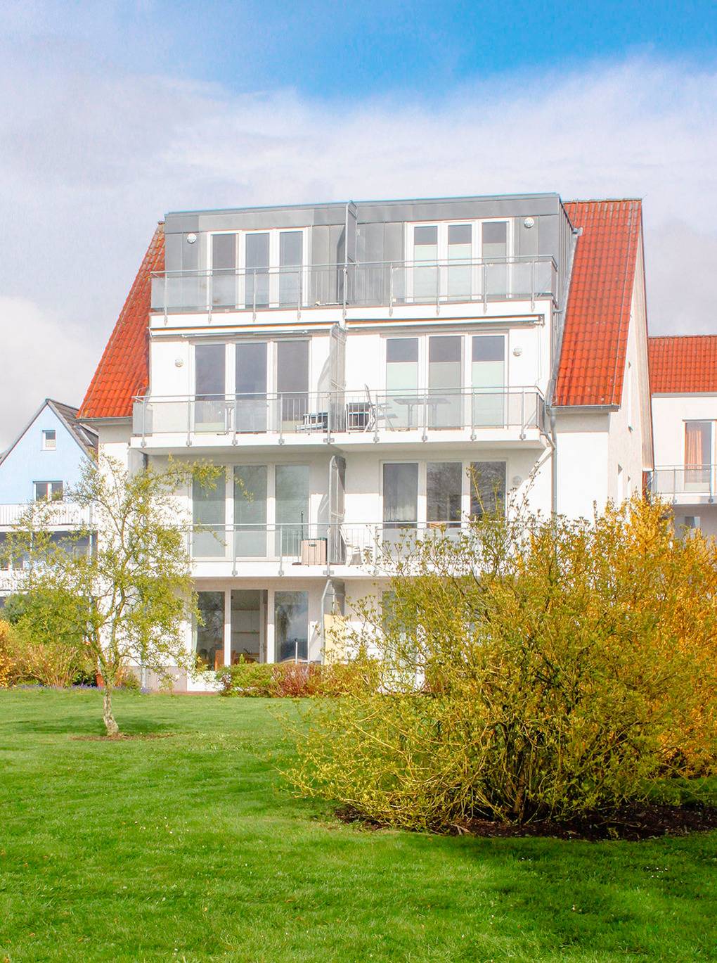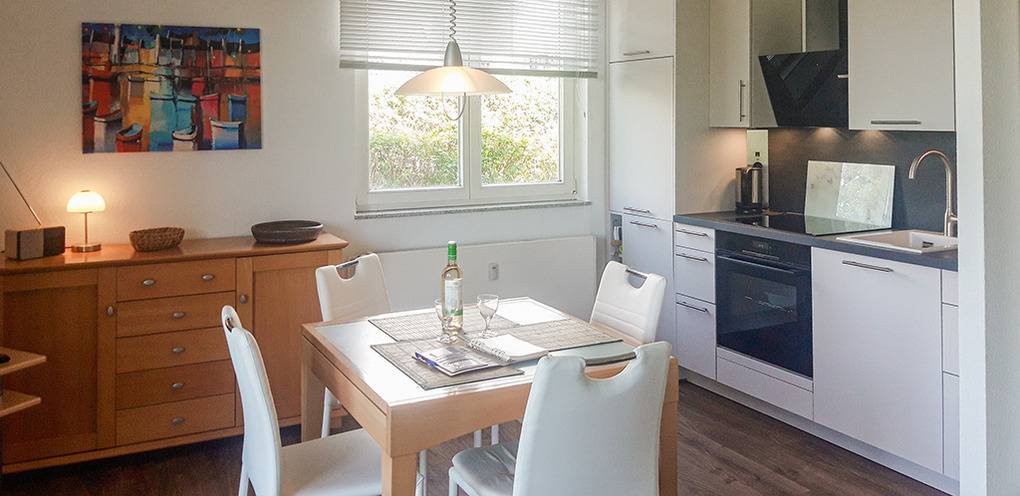 D 46.1 Wohnung 2-4 Pers.: 2-Zimmerwohnung, ca. 50 qm Wohnfläche. Wohn-/Essraum mit Sitzgarnitur (Ausziehcouch 2 Pers.), Esstisch, Küchenzeile (Backofen, Spülmaschine). Doppelzimmer. Bad/WC. Terrasse mit direktem Wasserblick, Gartenmöbeln.
