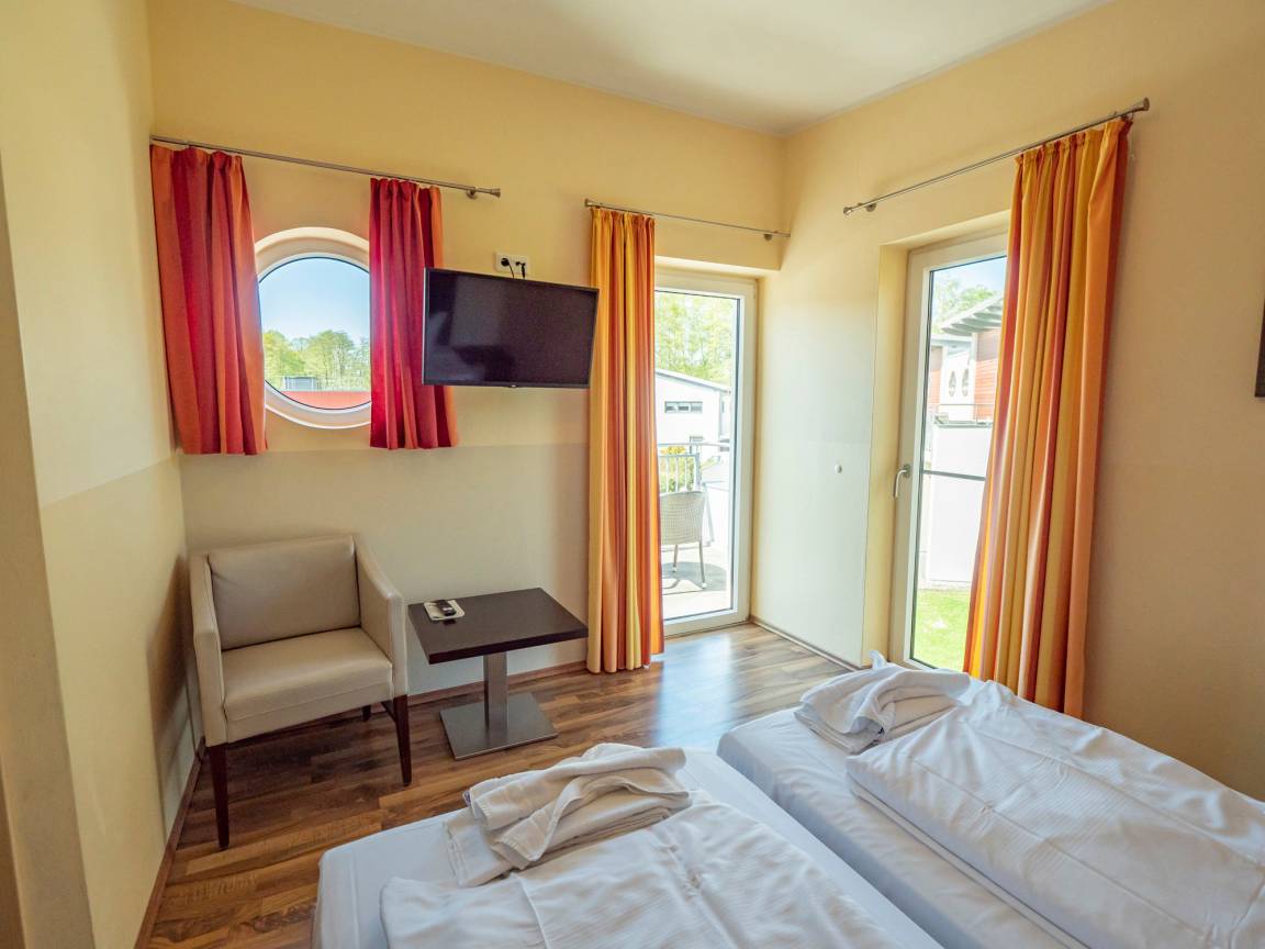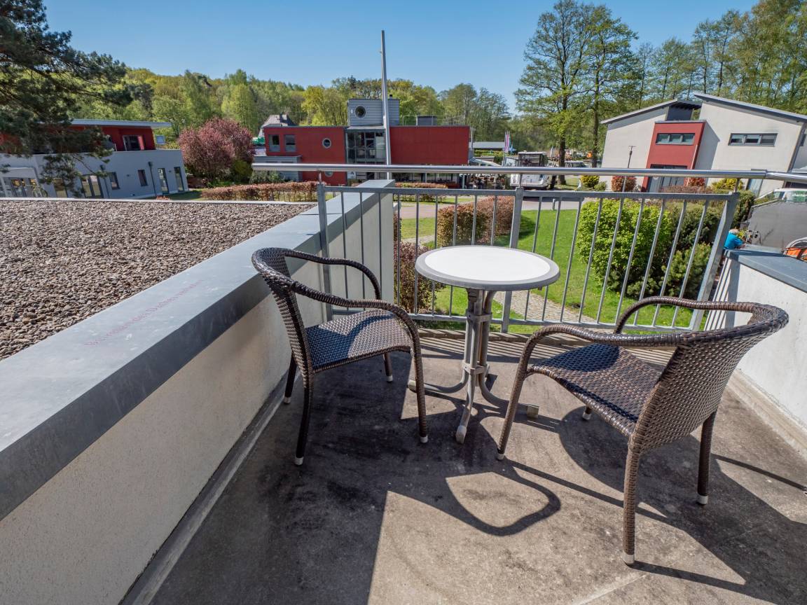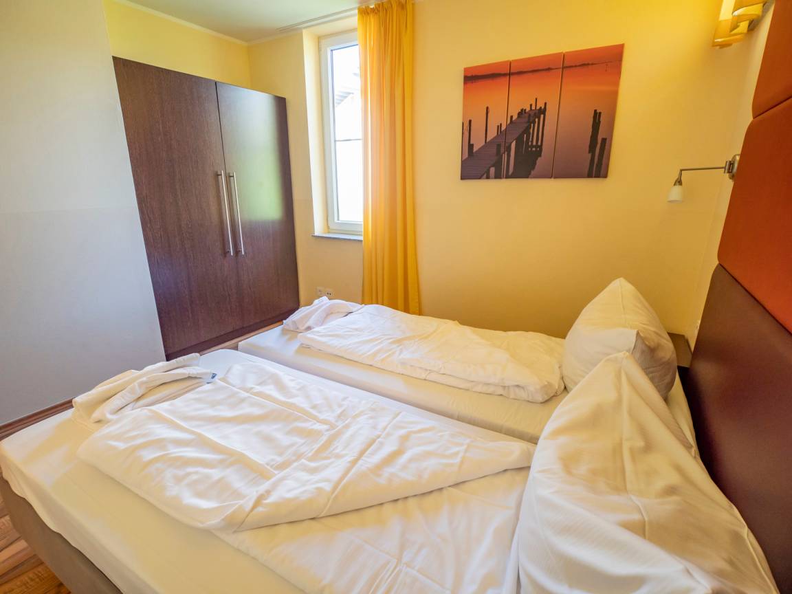 Die Wohnungen Müritz verfügen über zwei Doppelschlafzimmer mit jeweils eigenem Duschbad. Das Sofa im Wohnbereich lässt sich zu einem Doppelbett für zwei weitere Personen umbauen.
