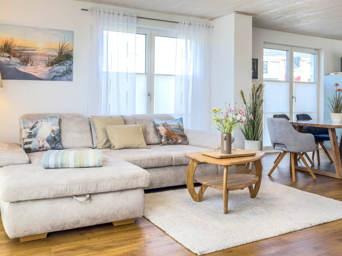 Das Ferienhaus Sonnenzauber empfängt Sie mit einem hellen, freundlichen Ambiente und viel Raum für Erholung. Der offene Wohnbereich mit gemütlicher Sitzgruppe lädt zu entspannten Abenden ein – ob beim Spielen mit der Familie, bei einem Film oder einfach beim Blick in den Garten.