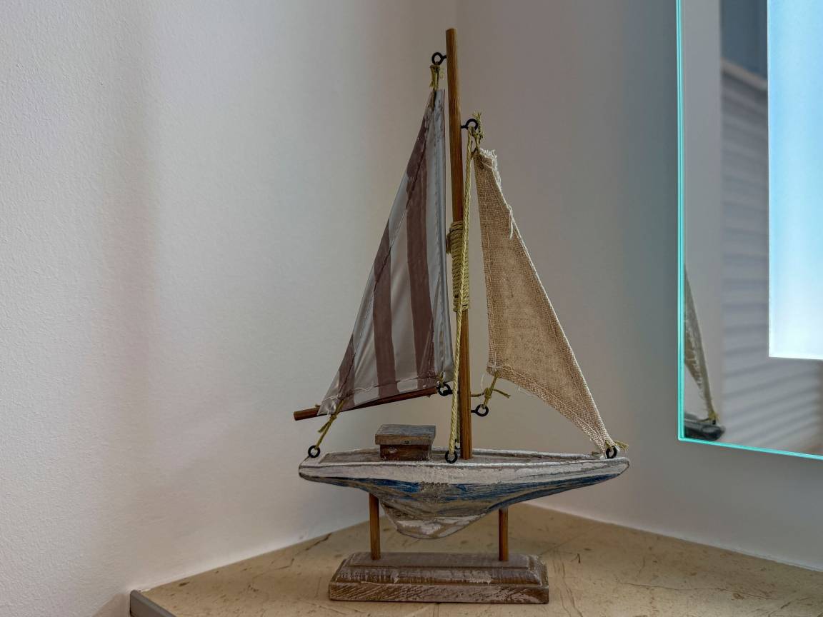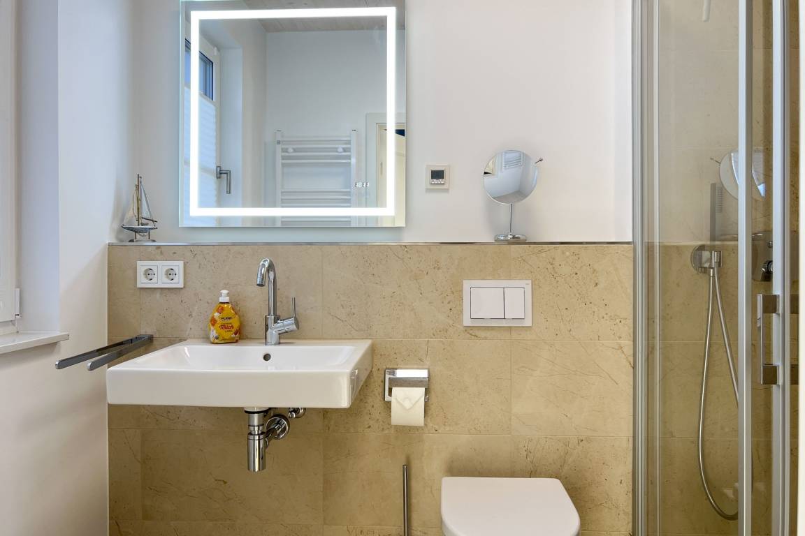 Die beiden Schlafzimmer sind komfortabel eingerichtet und sorgen für erholsame Nächte. Zwei Badezimmer mit bodengleichen Duschen und Fußbodenheizung bieten modernen Komfort, während das gesamte Haus durchdacht ausgestattet ist – von der Waschmaschine bis zum WLAN-Arbeitsbereich für alle, die auch im Urlaub produktiv bleiben möchten.