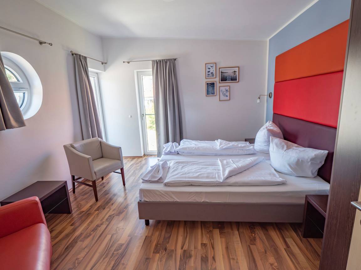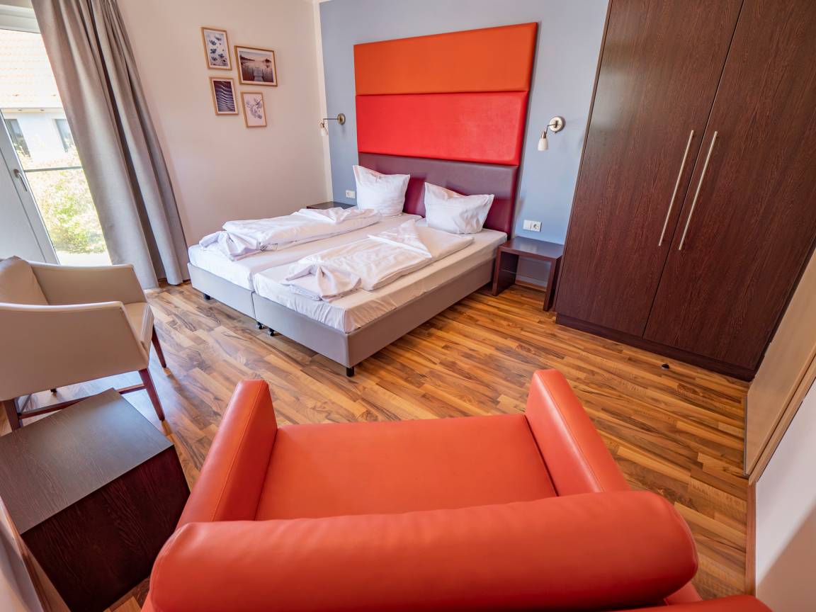 Die Wohnung Kölpinsee verfügt über ein Doppelschlafzimmer. Das Sofa im Wohnbereich lässt sich zu einem Doppelbett für zwei weitere Personen umbauen.